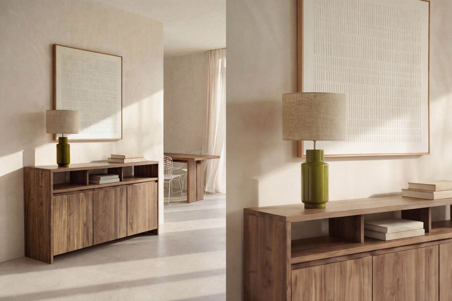 Uma das tendências mais marcantes é o regresso aos materiais naturais, com destaque para a madeira. Um aparador de madeira torna-se facilmente o ponto focal de uma sala ou hall de entrada, trazendo calor e autenticidade ao ambiente. Para além de funcional, este tipo de peça acrescenta textura e cria uma ligação direta com a natureza, algo cada vez mais valorizado no design de interiores.