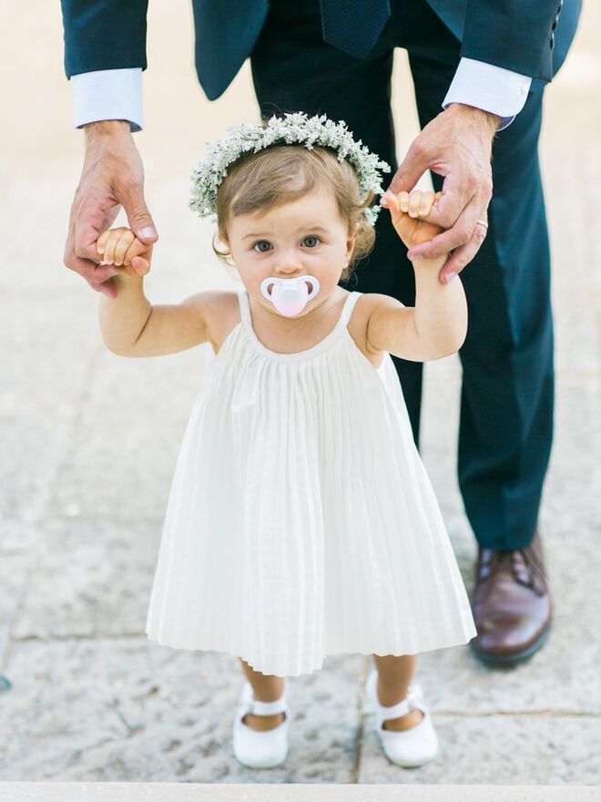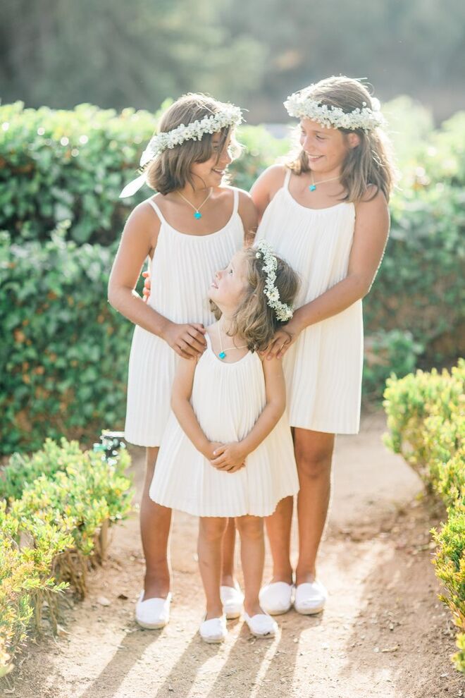 "Fui eu também que tratei das roupas dos miúdos. Para as meninas um vestido parecido com o 'top' do meu vestido feito em linho natural. Para os rapazes uma camisa de linho e calções em algodão branco. Foi perfeito porque esteve um calor impossível! Todos calçaram alpercatas brancas e as meninas usaram coroas de flores naturais feitas pela Graça O'Neill, que é tia do Miguel e que tratou - com o seu bom gosto irrepreensível - de todos os arranjos florais. Todos eles usaram também um fio azul escuro com uma cruz de cor turquesa, feitos pela minha sobrinha Vera, na altura com nove anos."