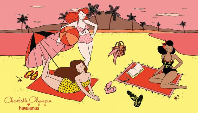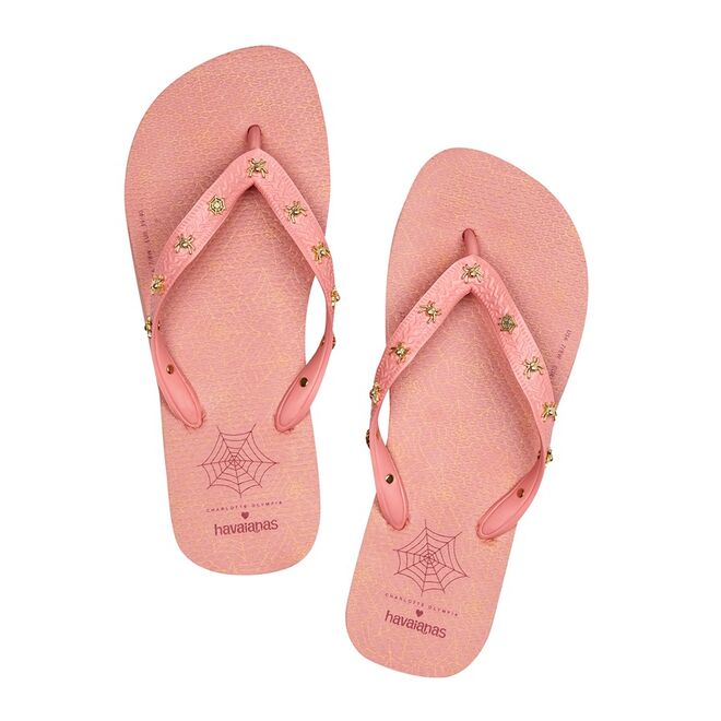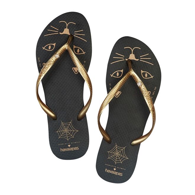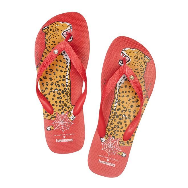A Havaianas volta a lançar uma coleção cápsula de chinelos, desta vez em parceria com Charlotte Olympia. A coleção abrange a palete de cores que são assinatura da marca: dourado, blush, vermelho e o print leopardo, celebram as características icónicas da Charlotte Olympia através da Kitty, do Leopardo Bruce e da Teia da Charlotte.