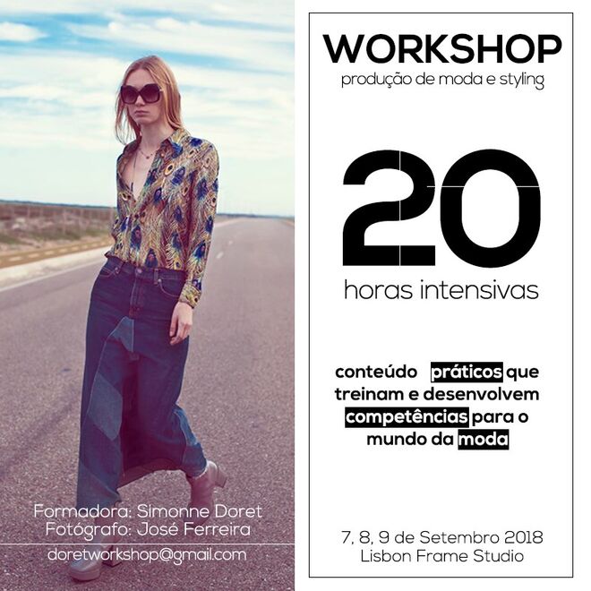 De 7 a 9 de setembro, o estúdio Lisbon Frame Studio recebe um workshop de moda e styling lecionado pela stylist Simonne Doret e pelo fotógrafo José Ferreira. Durante 20 horas intensivas, os formadores vão lecionar conteúdos práticos que treinam e desenvolvem competências para o mundo da moda. Para se inscrever basta enviar um e-mail para doretworkshop@gmail.com.