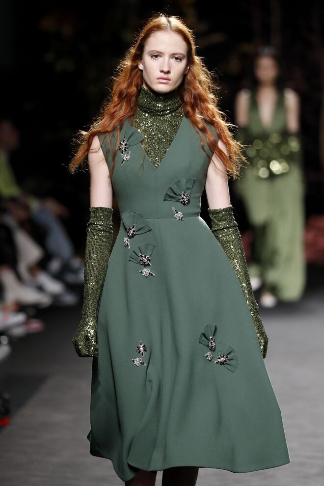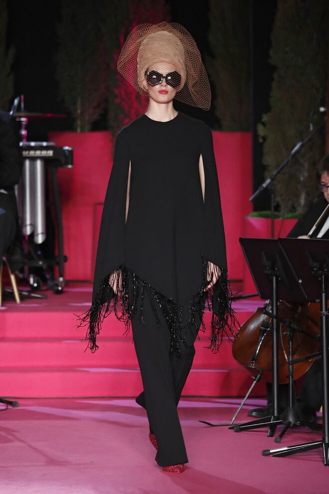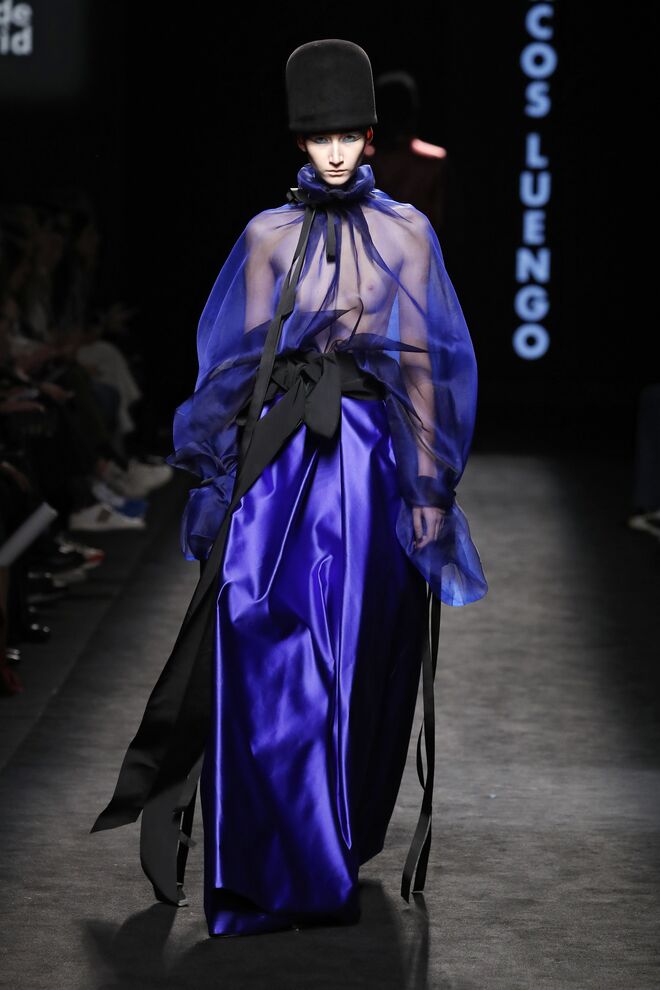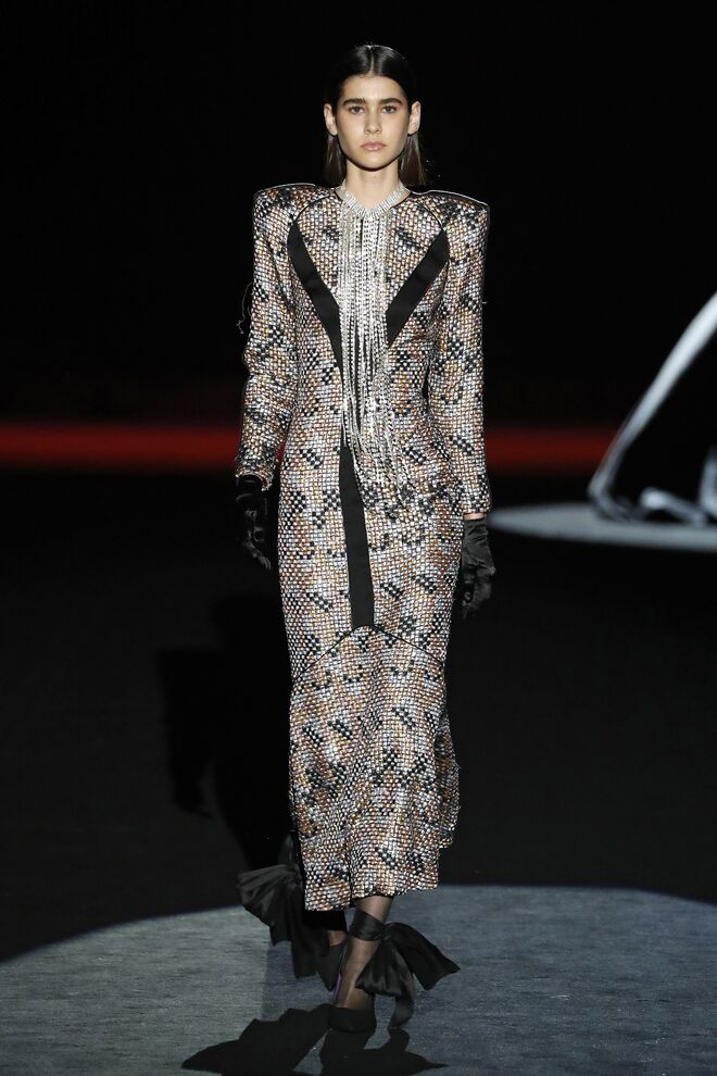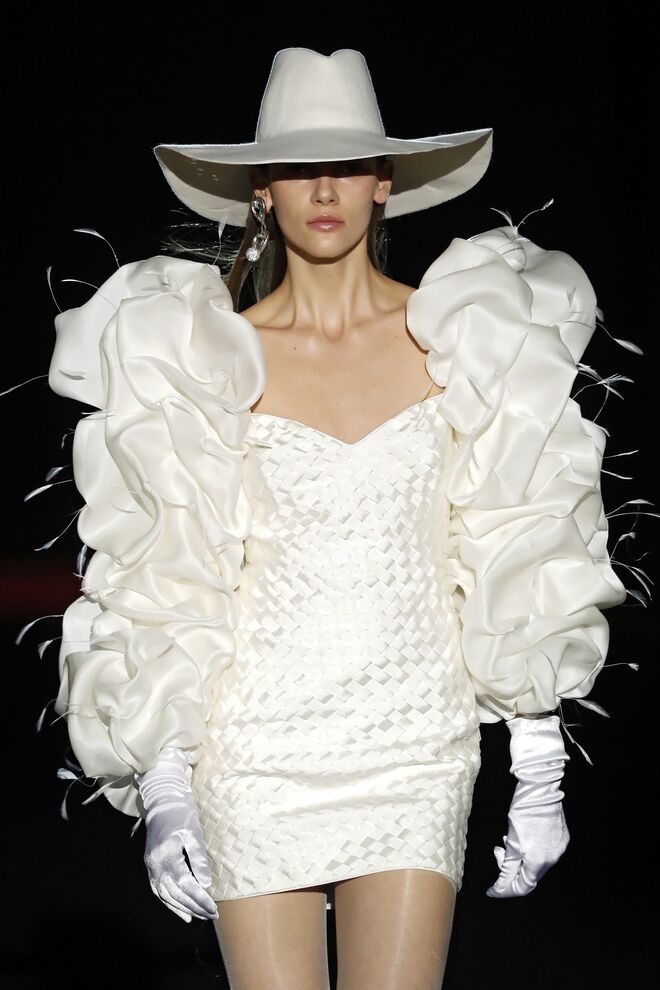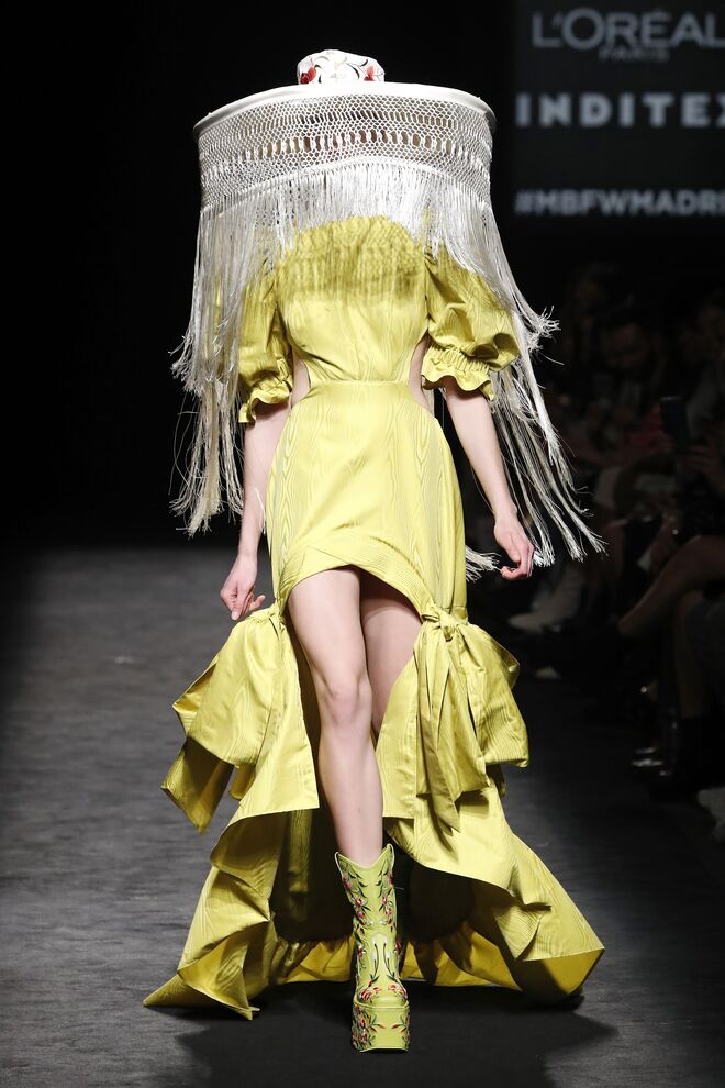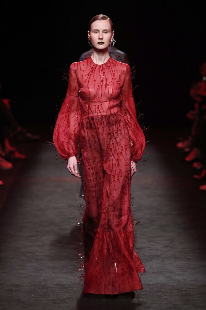A teatralidade da apresentação e a qualidade das roupas e bordados feitos à mão não deixaram o público indiferente. Vazquez recorreu ao arquivo da casa, reeditando padrões dos anos 1980 com cores poderosas e toucas de penas ou rede feitas pela Tolentino Hats exclusivamente para a Pertegaz.
