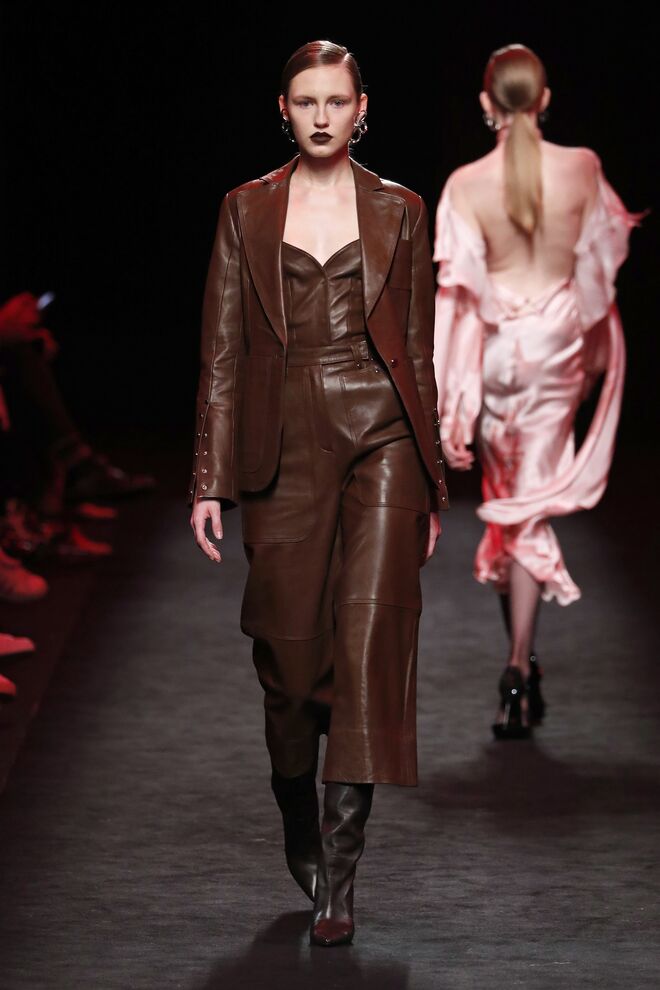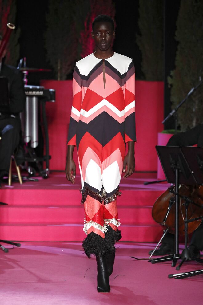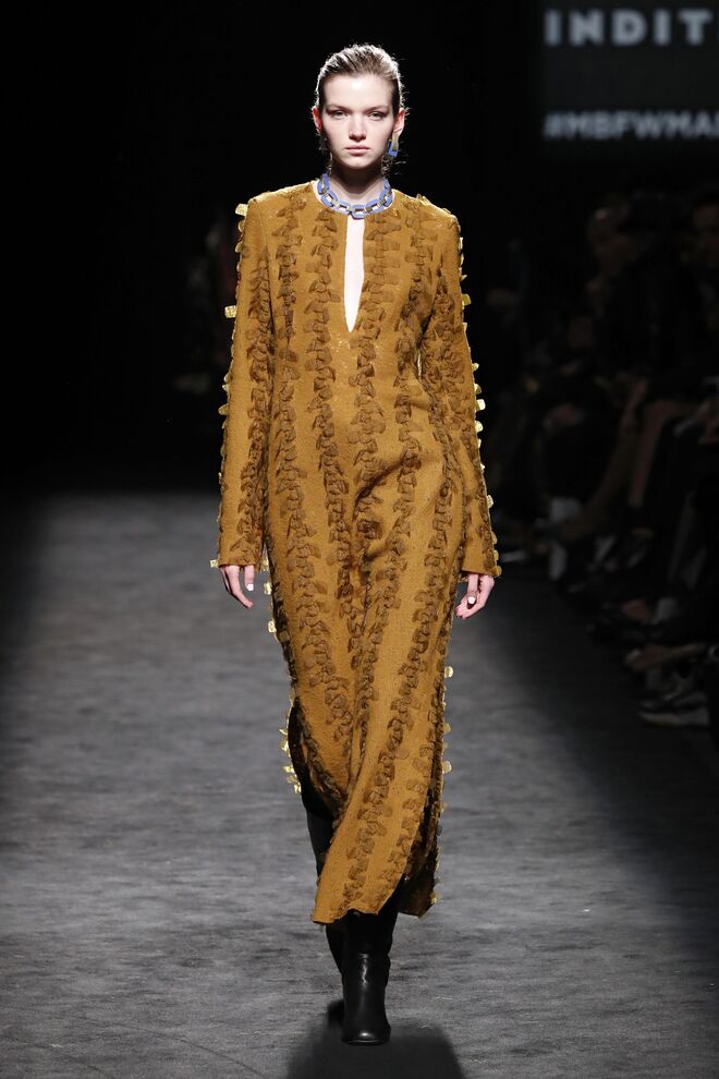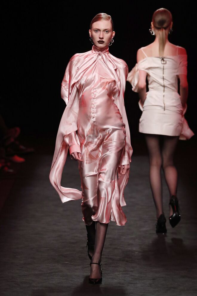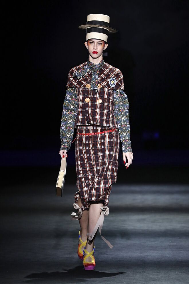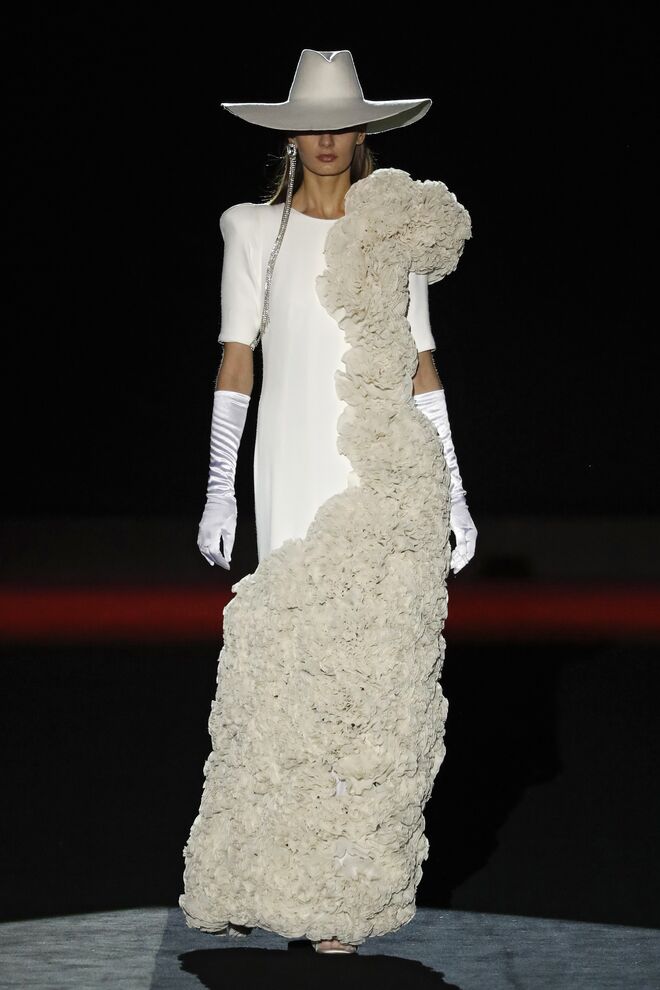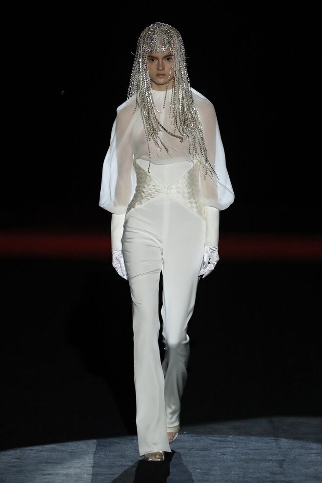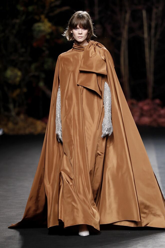 A teatralidade da apresentação e a qualidade das roupas e bordados feitos à mão não deixaram o público indiferente. Vazquez recorreu ao arquivo da casa, reeditando padrões dos anos 1980 com cores poderosas e toucas de penas ou rede feitas pela Tolentino Hats exclusivamente para a Pertegaz.