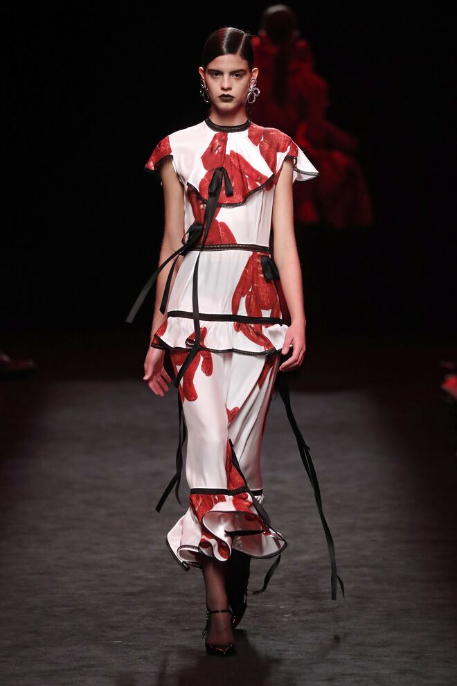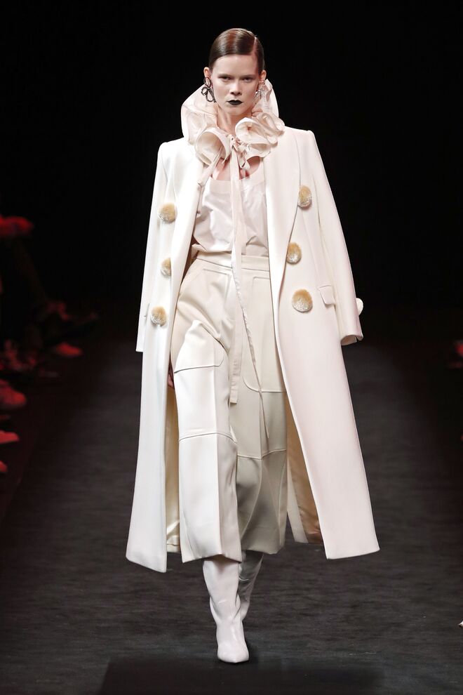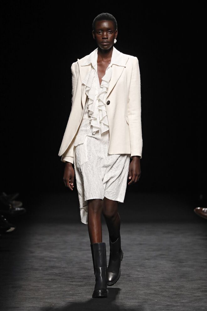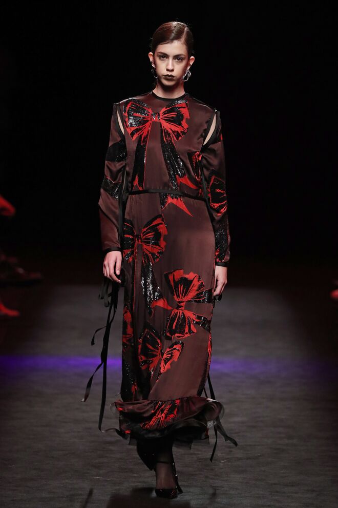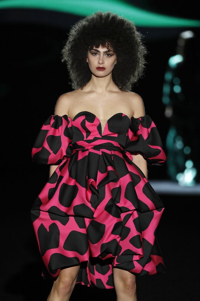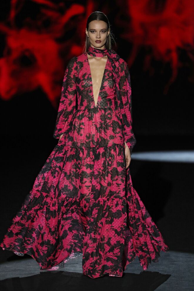 O diretor criativo Domingo Rodríguez é um dos poucos criadores que assume o risco na moda e acerta em cheio. A nova coleção Idolatría mostra bem isto. Com Rosalía na banda sonora, as modelos desfilaram looks inspirados nos grandes nomes espanhóis, desde Pablo Picasso a Pedro Almodóvar e Penélope Cruz. As peças exploraram texturas, com materiais como o tule bordado de lantejoulas, pele, jacquard de seda e muitas franjas e xailes de Manila transformados em blusas ou vestidos.