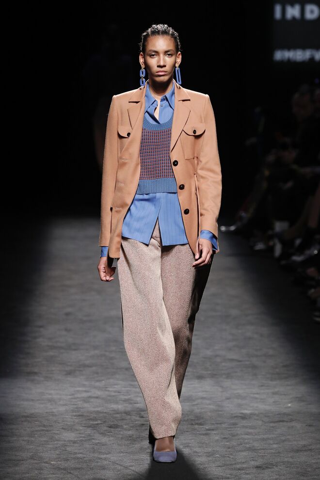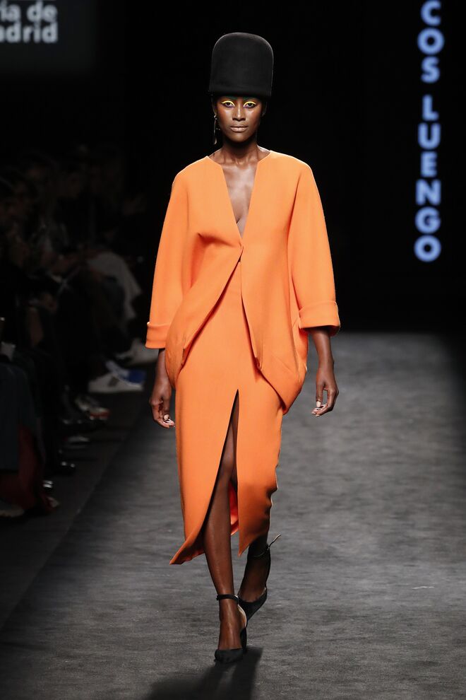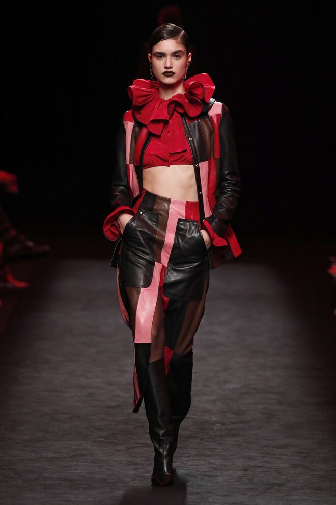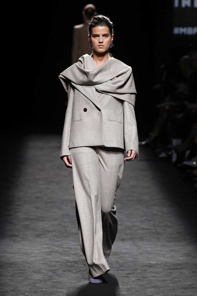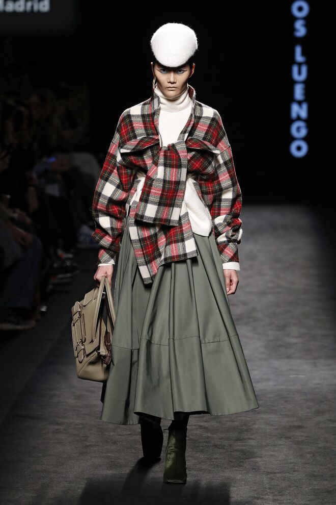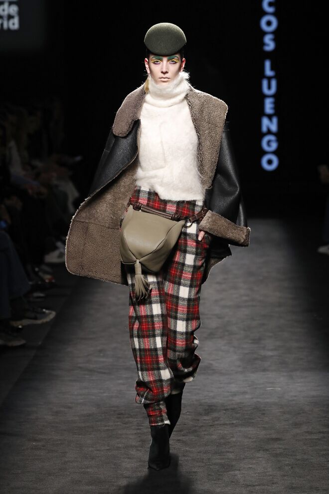 A nossa peça favorita: Dividimos a nossa atenção entre o sobretudo creme com pompons no lugar dos botões e no macacão em pele vermelha, mas por fim elegemos o blazer de patchwork, uma peça única, sendo impossível replicá-la em cada confeção. "O meu pai era alfaiate e, na década de 1960, comprou muitos cortes de fato do Reino Unido – um corte de fato é a metragem que se utiliza para fazer um fato, mais ou menos uns 2,30 metros", explica à Máxima Juan Vidal no backstage do desfile na Semana de Moda de Madrid. "Então o que tenho é um armazém cheio desses tecidos. E o que decidi foi utilizar cada um desses numa peça de blazer", afirmou, segurando o nosso blazer de eleição nas mãos.