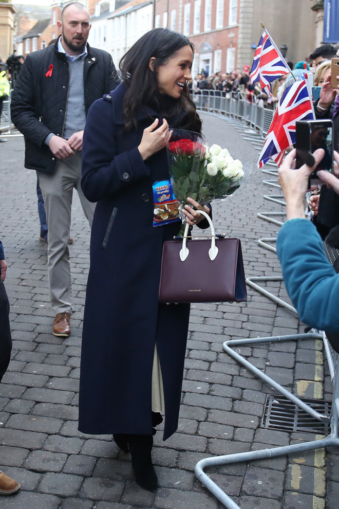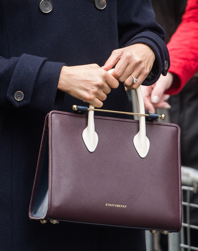 Assim aconteceu no passado sábado, quando Meghan voltou a surgir em público ao lado de Harry, em Nottingham. O seu casaco azul-escuro chamou a atenção, mas foi sobretudo a carteira da marca Strathberry que deu nas vistas.