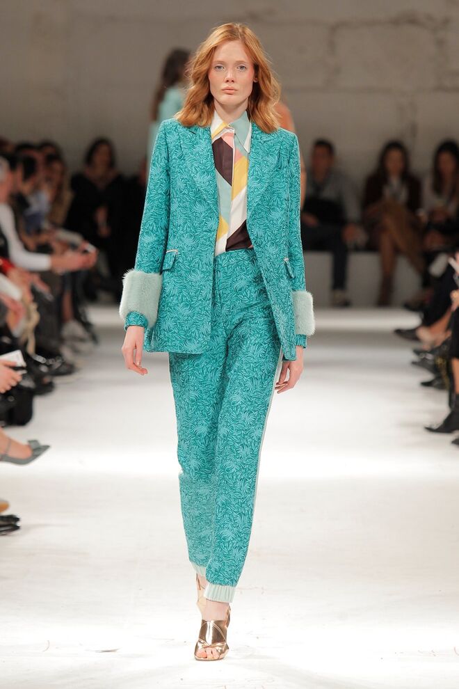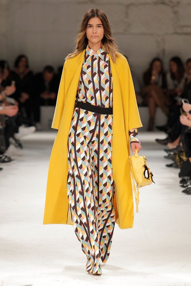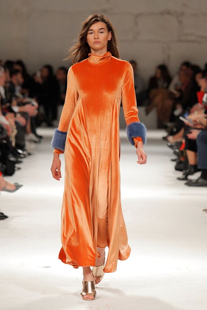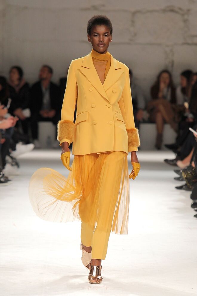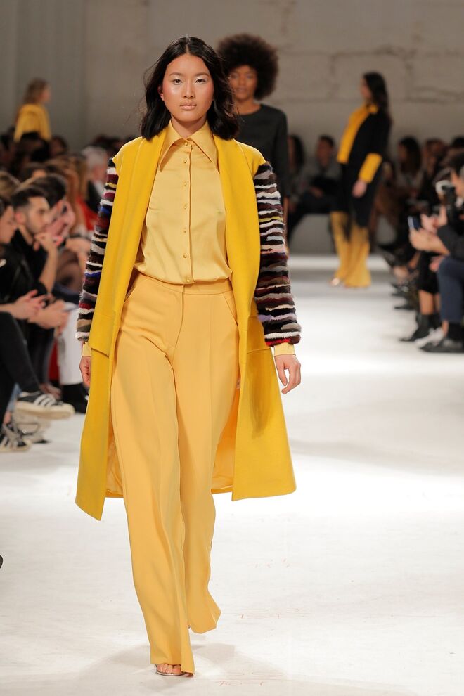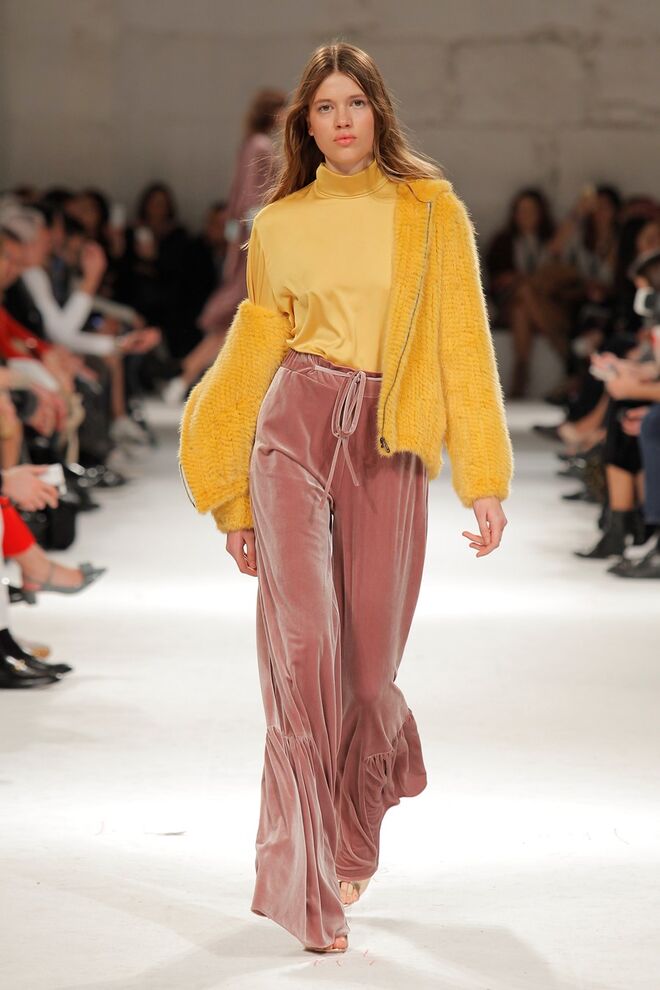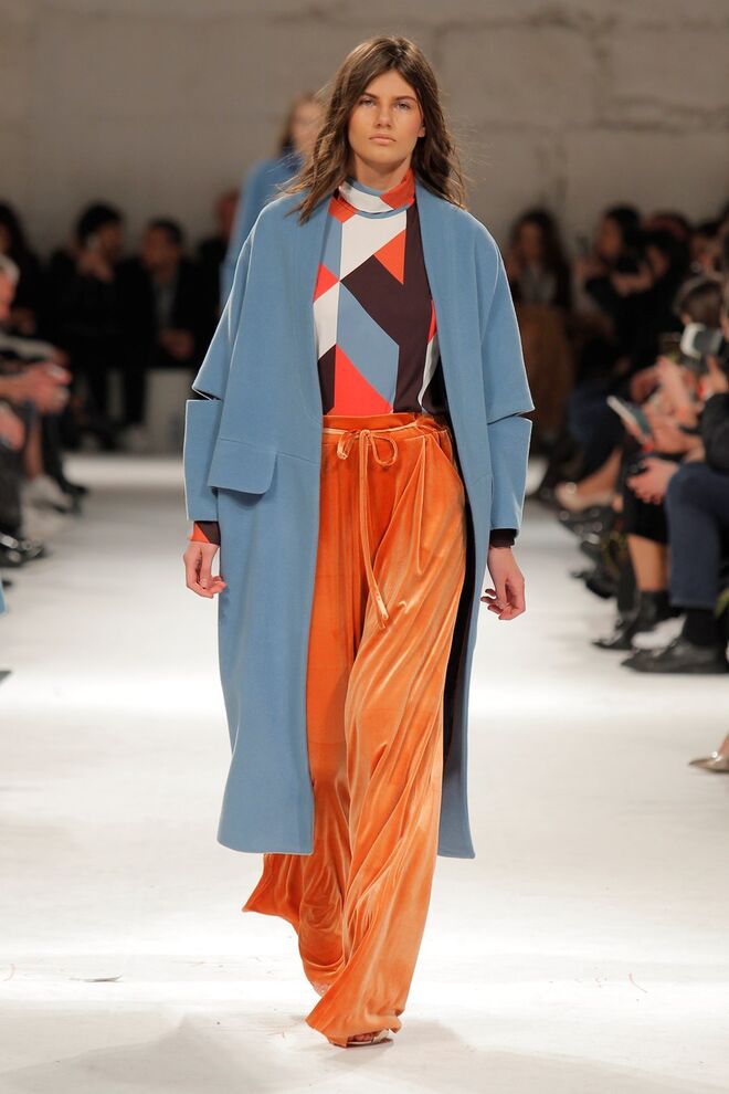 A paleta cromática revela cores tão distintas como rosa pó, amarelo olho de gato, verde água, azul crepúsculo, laranja queimado, coral e preto. Os materiais de destaque são os brocados, os veludos, os pelos volumosos, os tules delicados, os tecidos brilhantes e as caxemiras macias.