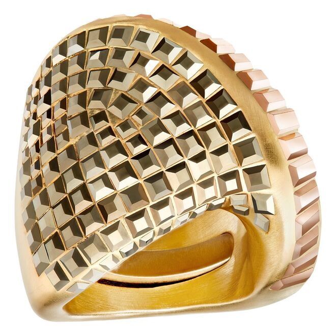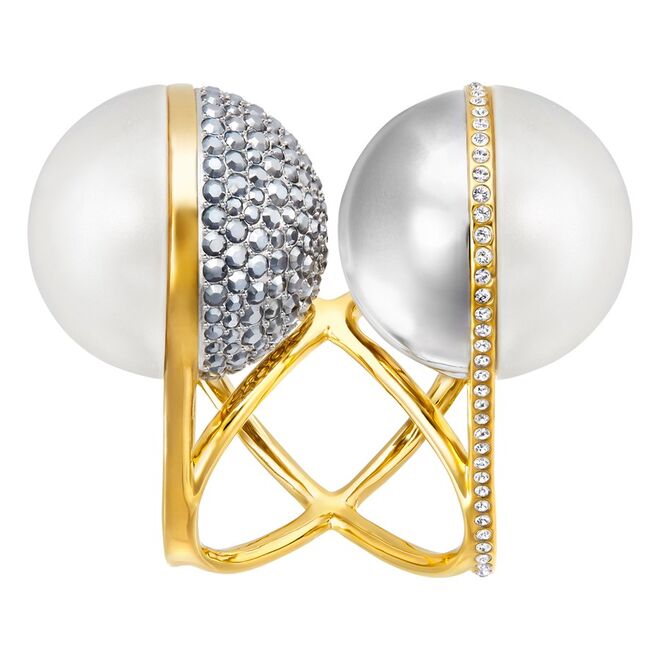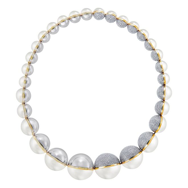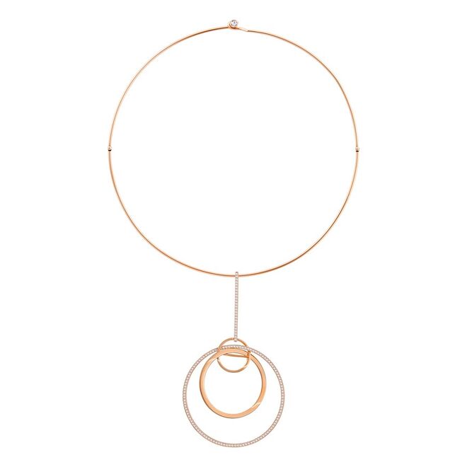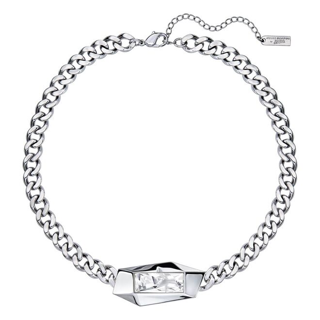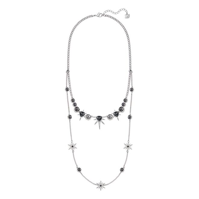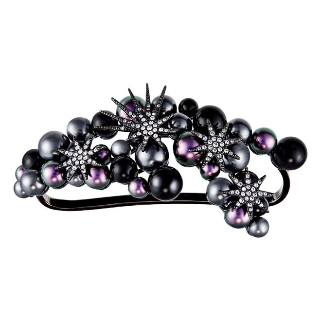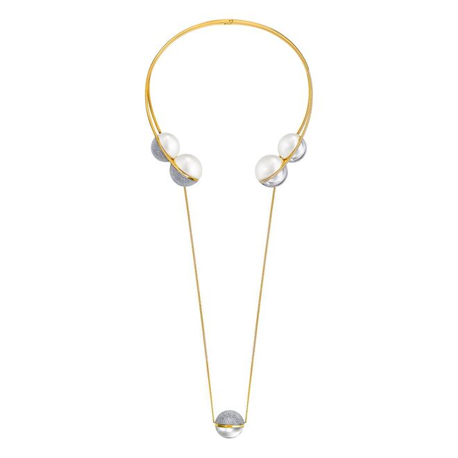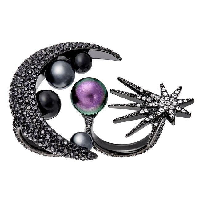 Estrelas cadentes e cometas transitam entre designs delicados com um toque de elegância rock chic, realçados pela paleta de cores contrastantes de efeito chiaroscuro. Os cristais evocam a lua, enquanto estrelas pontiagudas cintilam num deslumbrante pavé de cristais, que simbolizam os raios de luar. A linha “Fatal” é o exemplo perfeito desta interpretação, com a elegância intemporal das pérolas e o moderno revestimento PVD. Por outro lado, os planetas em órbita são representados em formas esféricas que parecem flutuar, sem peso, montadas em metal liso. Simplicidade é a palavra de ordem, ecoando a calma e o silêncio da galáxia. A linha “Festival” homenageia as supernovas, com uma combinação moderna de Crystal Pearls e esferas metálicas. Esta linha oferece opções versáteis: o colar longo dá lugar à gargantilha, enquanto o anel pode ser utilizado com as esferas apoiadas no dedo em alinhamento vertical ou horizontal.