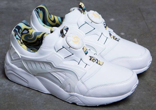 O modelo Puma Disc Blaze está disponível em branco, por €130, e o Puma Suede em preto, por €96. Ambos incluem detalhes das figuras animadas, tanto no interior como no exterior do design.