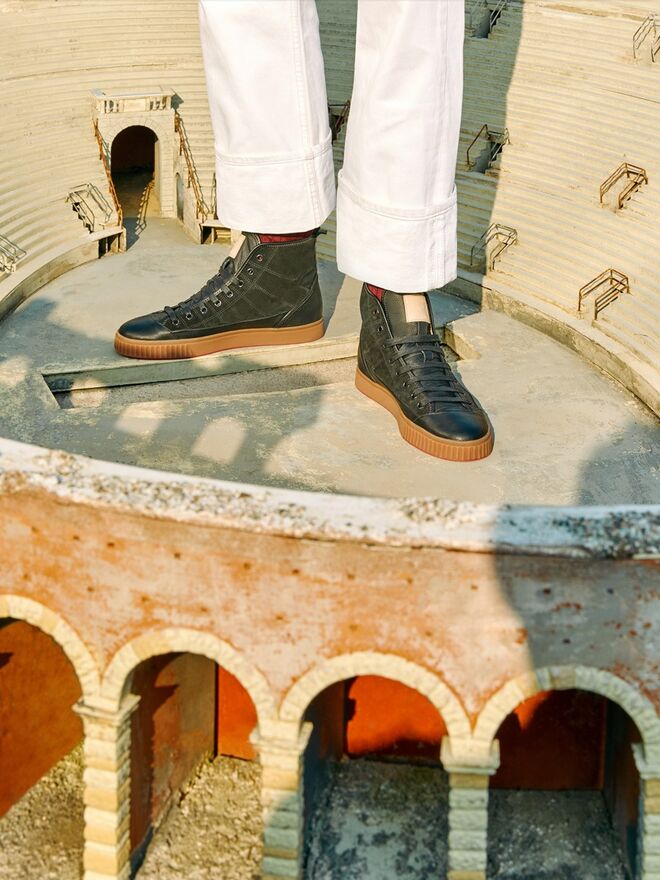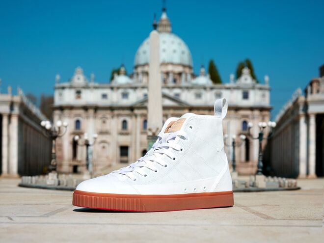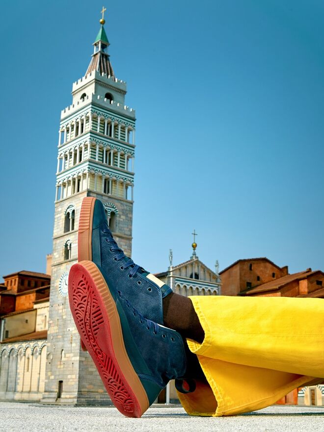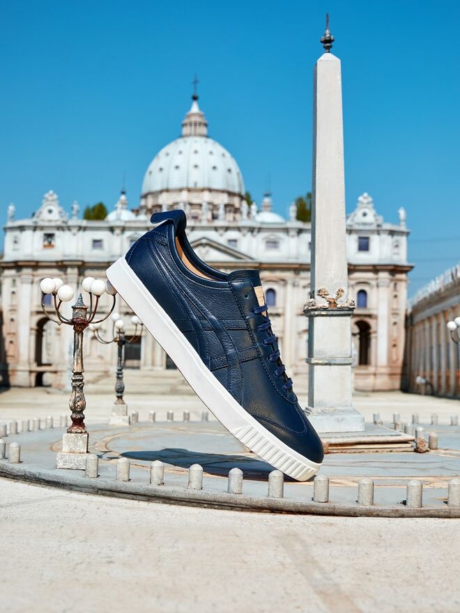 Os novos ténis estão disponíveis em branco, preto, massapão e ganga escura e vêm numa caixa com as três cores italianas e um saco com as palavras "Made in Italy" impresso em folha de ouro.