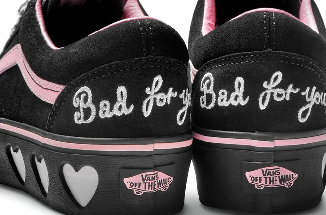 A coleção que juntou a Vans com a marca londrina reinventa os ténis Old Skool, personalizando-os com corações e com a frase "Bad for you", e os Classic, que são agora rosa. A coleção inclui ainda hoodies e meias.