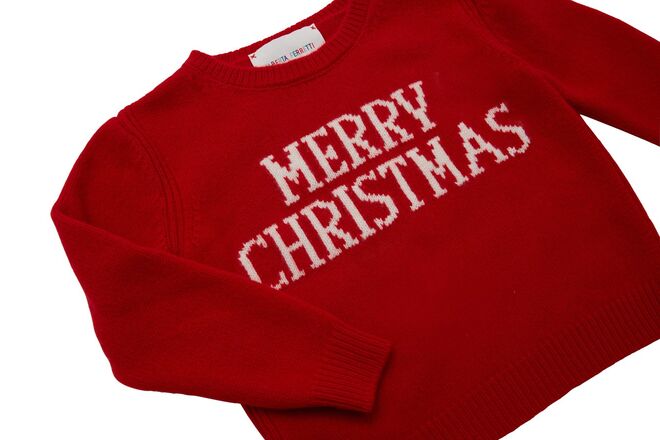 Para celebrar a época festiva que se aproxima, a designer Alberta Ferretti juntou-se ao site de luxo Luisa Via Roma para criar uma versão exclusiva da icónica rainbow sweater, uma camisola de malha criada pela marca e vendida em várias cores, cada uma com um dia da semana escrito. Mantendo a mesma silhueta em malha e caxemira vermelha, esta nova versão diz "Merry Christmas" em branco.