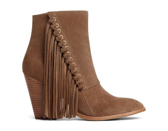 botins estruturados em camurça adornados com franjas que estão, aliás, presentes em malas de diversas