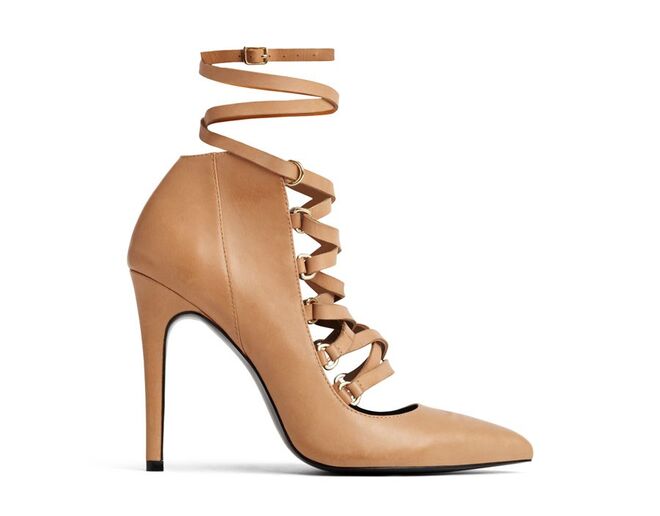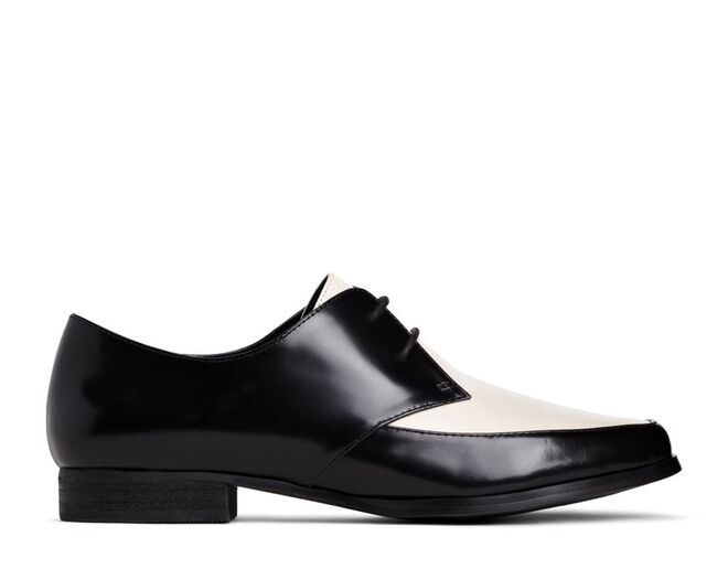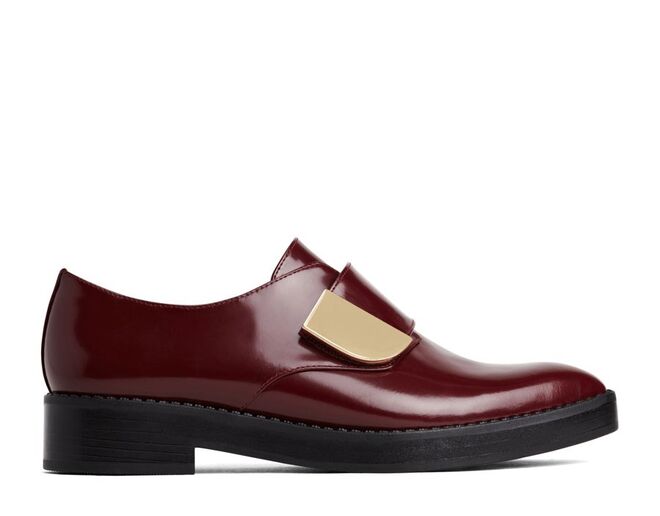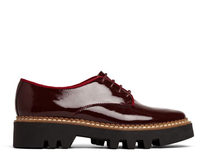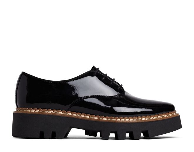 Uma das novidades são sapatos de atacadores de inspiração britânica com acabamentos glossy e com saltos do tipo
