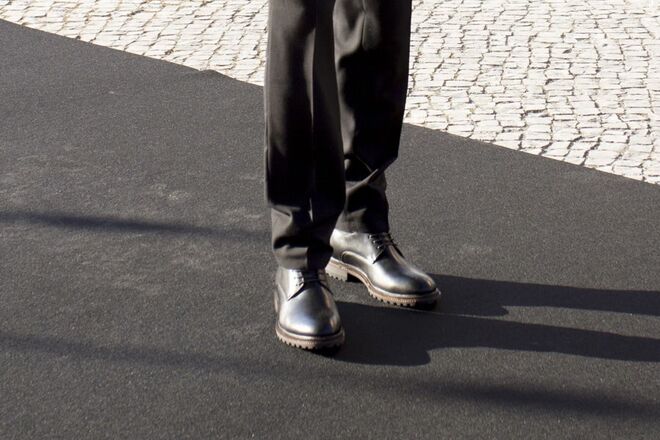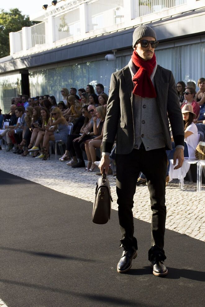 também em oxfords com solas mais robustas. A palete é dominada pelos tons de areia, terra e cinzas pontuadas