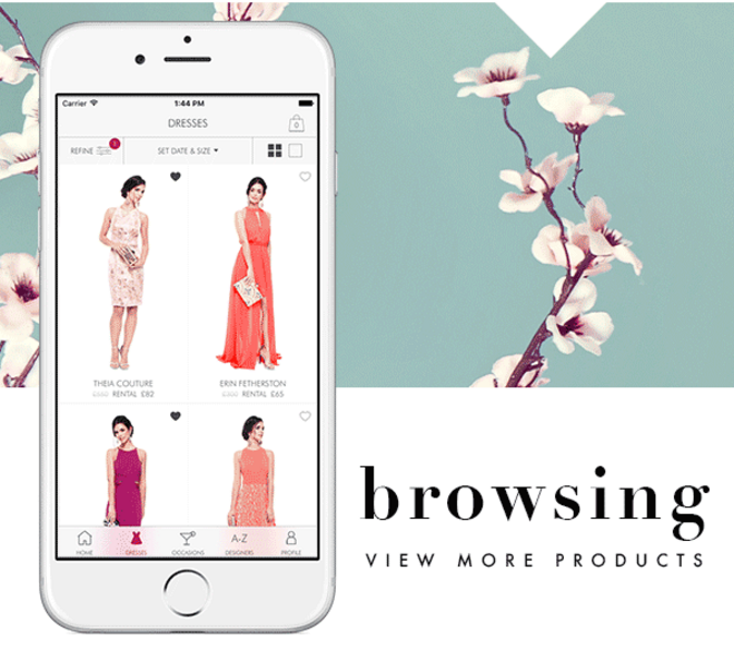 O utilizador tem acesso ao stock completo da Chic by Choice, que inclui mais de 1000 modelos de vestidos de marcas e designers internacionais de luxo (DVF, Self Portrait, Red Valentino, Rami Al Ali, BCBG Max Azria, Raoul, Tadashi Shoji, entre muitos outros) além dos recentemente incluídos acessórios das marcas Mawi, Kotur e Bauble Bar.