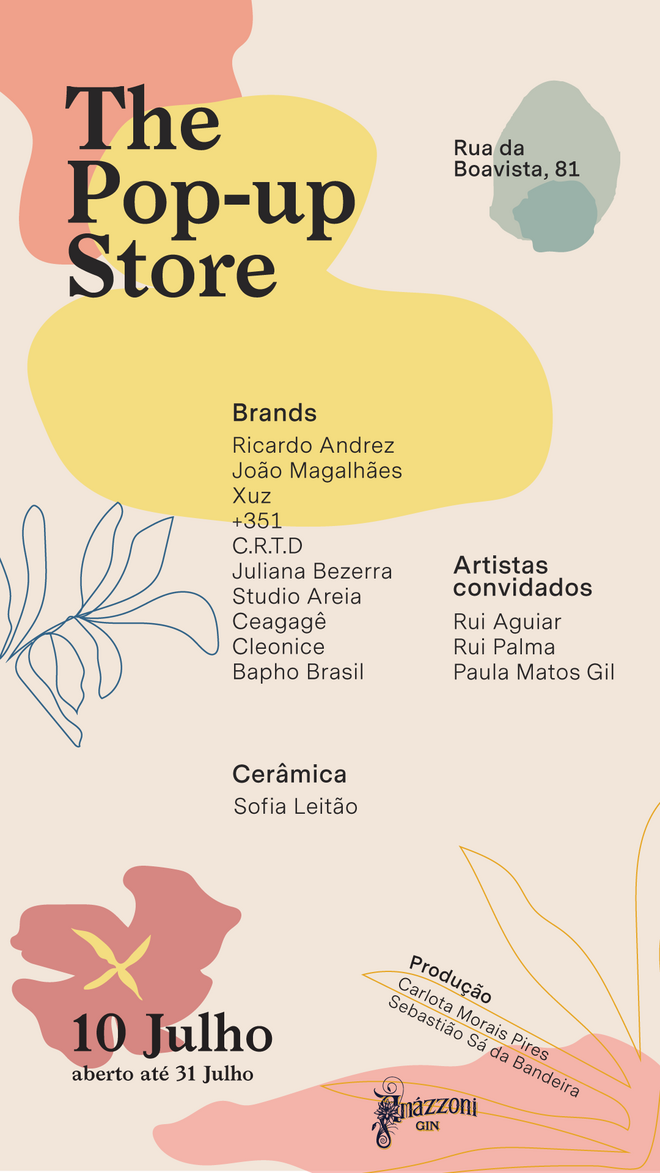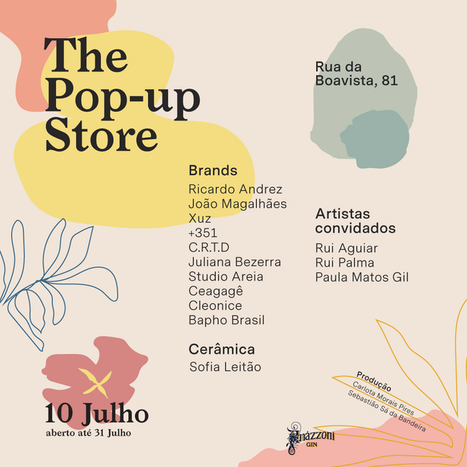 Com inauguração marcada para dia 10, a The Pop-Up Store é um projeto que nasce com o intuito de cruzar diferentes universos criativos num único espaço e de divulgar o trabalho desses criadores que, em sua maioria, não tem uma loja física. Assim, as marcas Ricardo Andrez, João Magalhães, Juliana Bezerra, Studio Areia, Bapho Brasil, Cleonice, Ceagagê, C.R.T.D, +351 e XUZ estarão expostas no número 81 da Rua da Boavista de 10 a 31 de julho, todos os dias, das 10 às 20h, com intervenção artística dos fotógrafos Rui Aguiar, Rui Palma e Paula Matos Gil, e da ceramista Sofia Leitão, além de uma agenda com DJ sets e tatuadores.