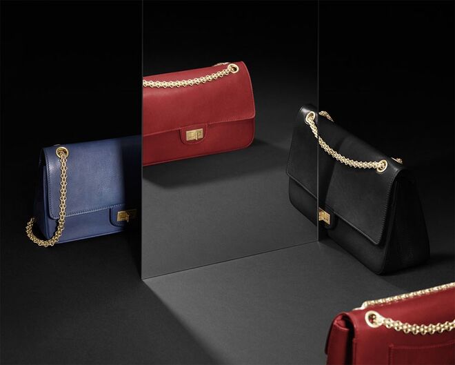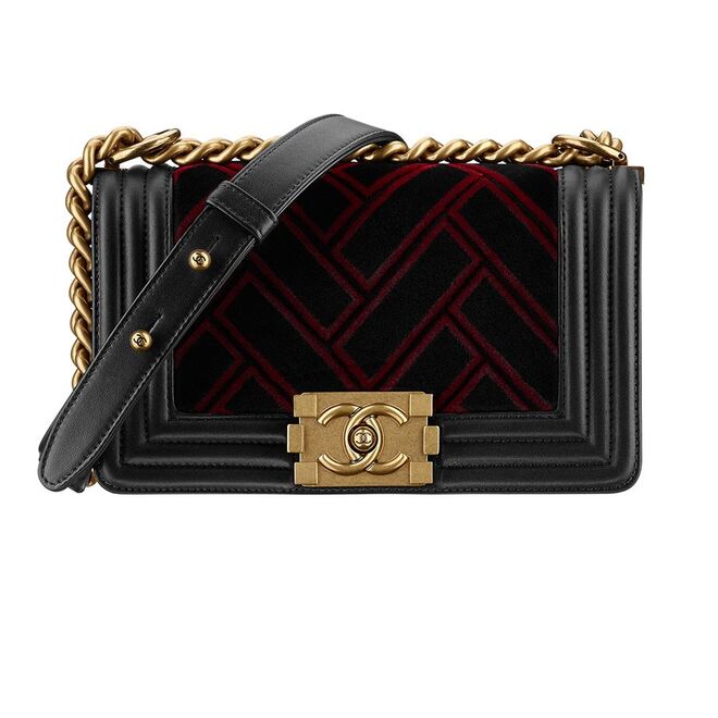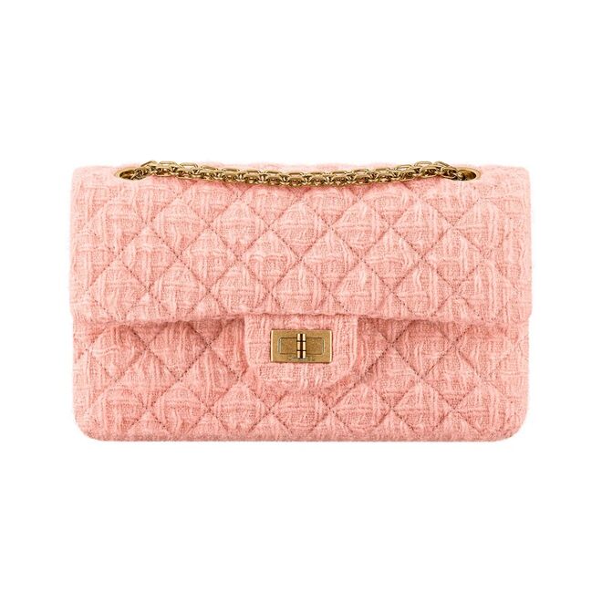 A carteira Boy CHANEL é reinterpretada em veludo estilo "espinha de peixe" ou couro bicolor, enquanto a bolsa icônica surge em tweed rosa ou bordada com contas e strass.