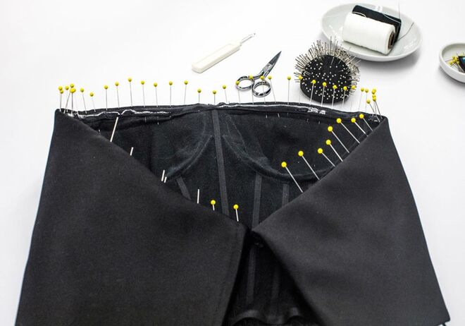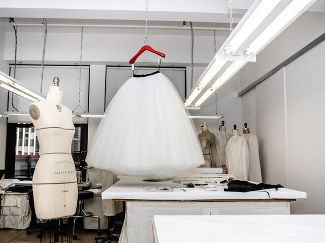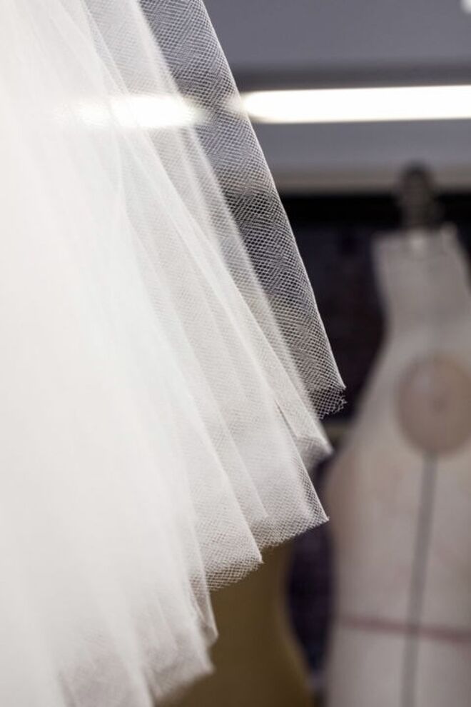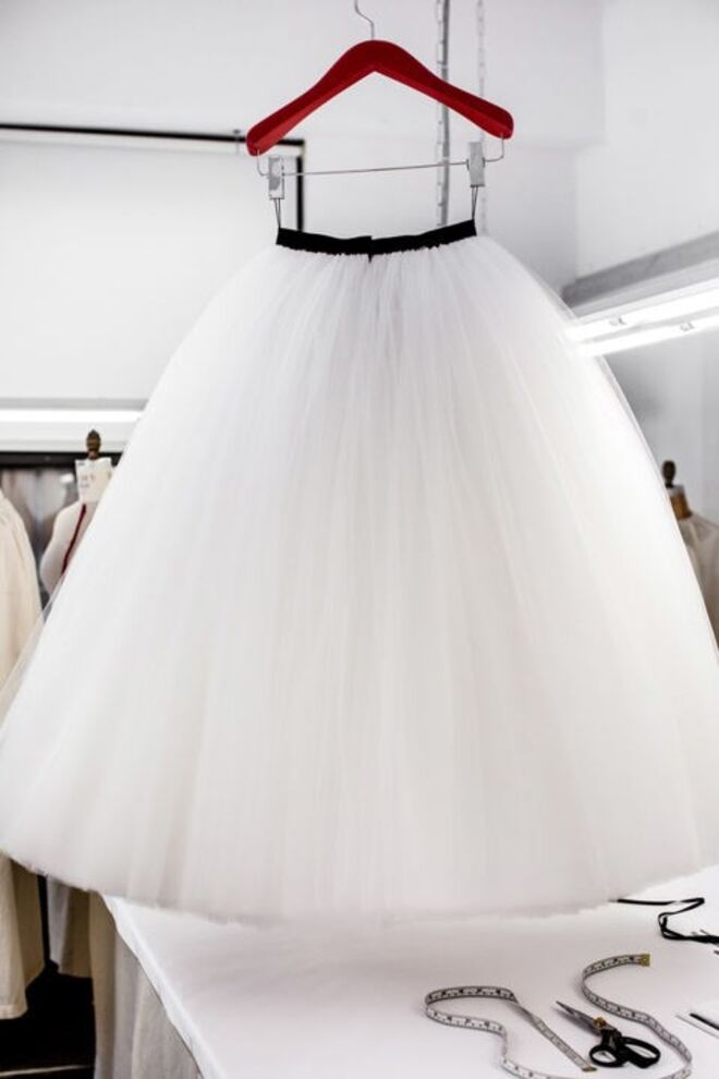 A saia foi construída com mais de 70 partes individuais de tule, cortadas de forma minuciosa, em 15 diferentes tamanhos, de maneira a criar o efeito de preenchimento gradual.