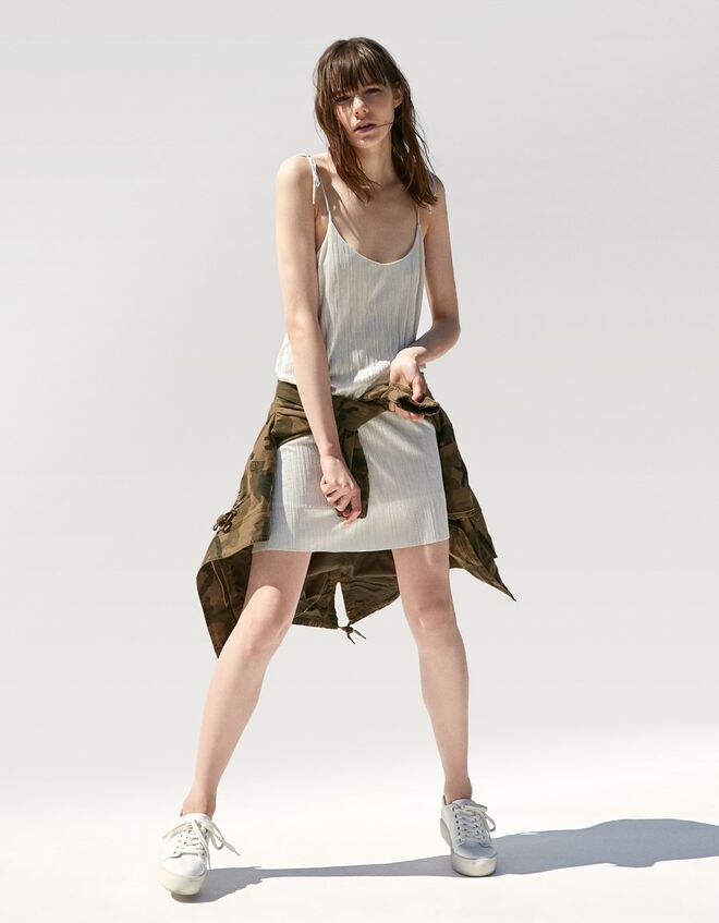 Com um estilo urbano, a coleção recorre a uma ampla variedade de modelos: curtos, midi, oversize, compridos, assim como uma grande variedade de tecidos como o algodão, o soft denim e o cetim. Como novidade, destacam-se os estampados tie-dye e folhos que dão volume e frescura aos tecidos mais fluidos.