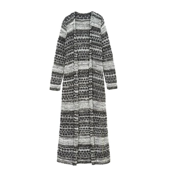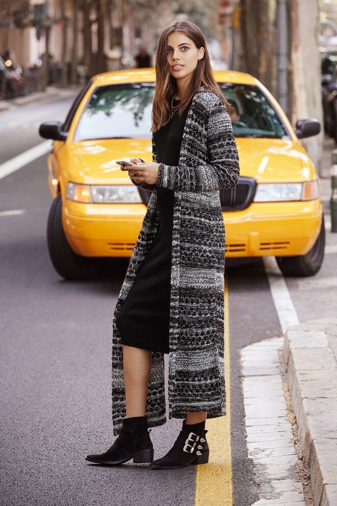 O casaco de malha maxi, joga com o long fit até aos pés, criando um efeito de sobreposições no look total.