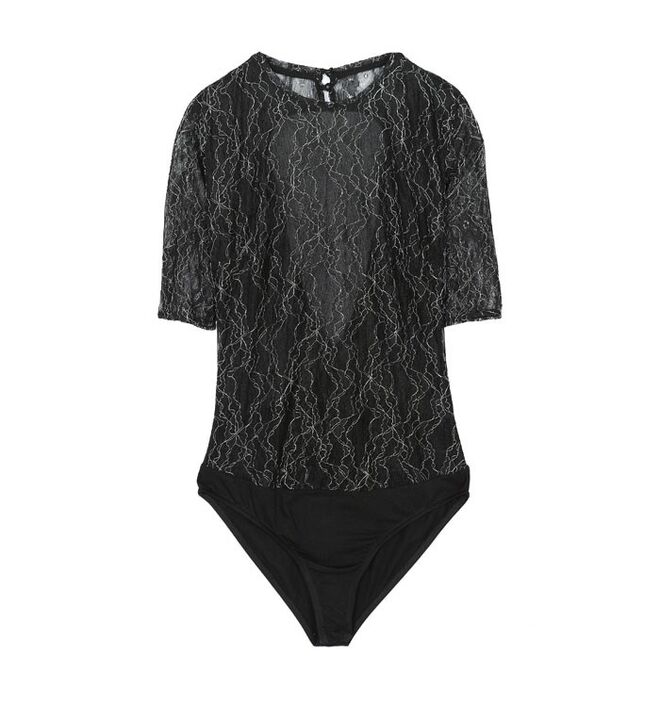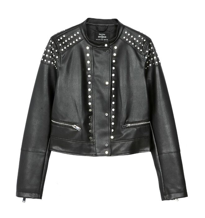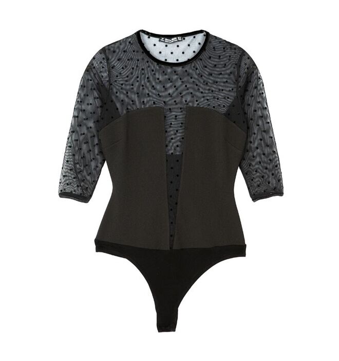 Um look sofisticado com um toque rock, que combina peças justas ao corpo com peças de grande volume e de materiais fluidos.