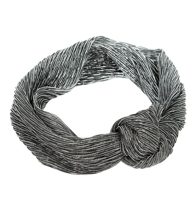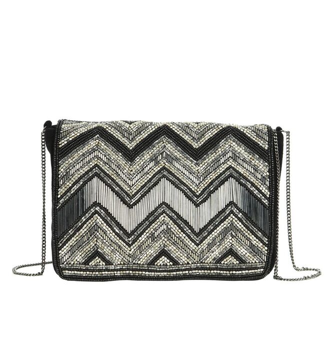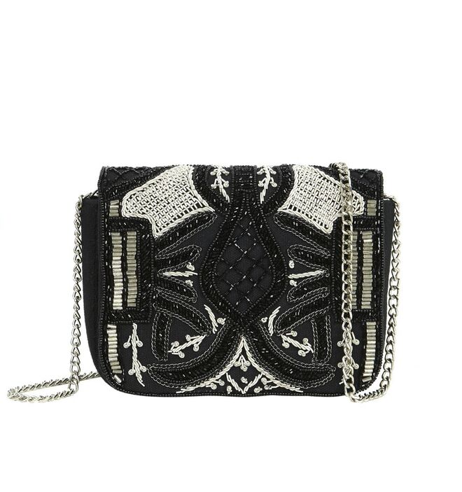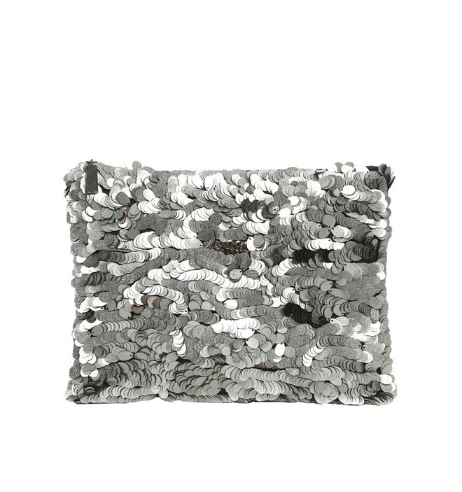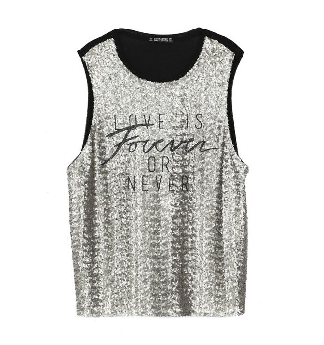 Nos acessórios e no calçado, utilizam-se aplicações metálicas e lantejoulas em tons prateados e preto brilhante.