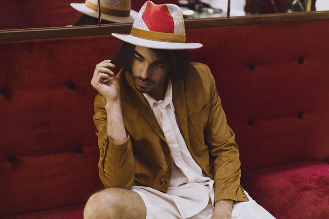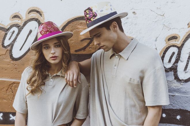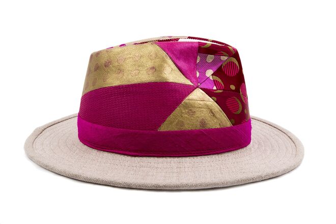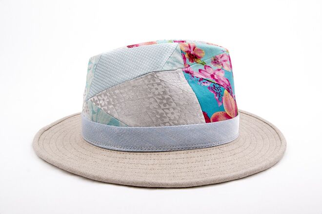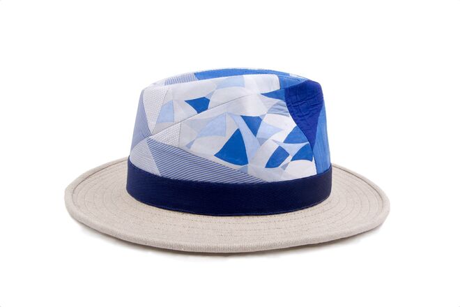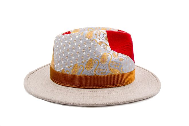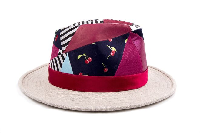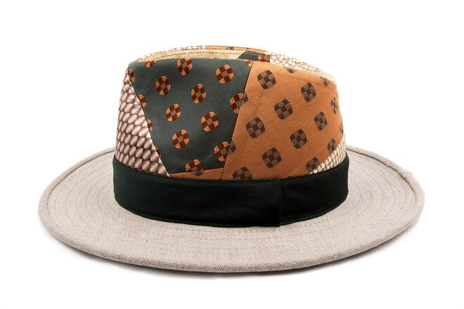 Inspirados no universo vintage dos anos 70, surgem modelos de chapelaria únicos e exclusivos, manufaturados através de técnicas tradicionais. Cada peça é feita manualmente e apresenta um patchwork conseguido a partir da combinação de padrões de gravatas de seda vintage.
