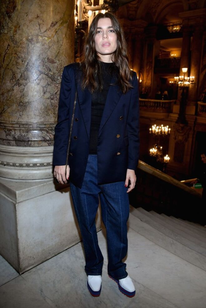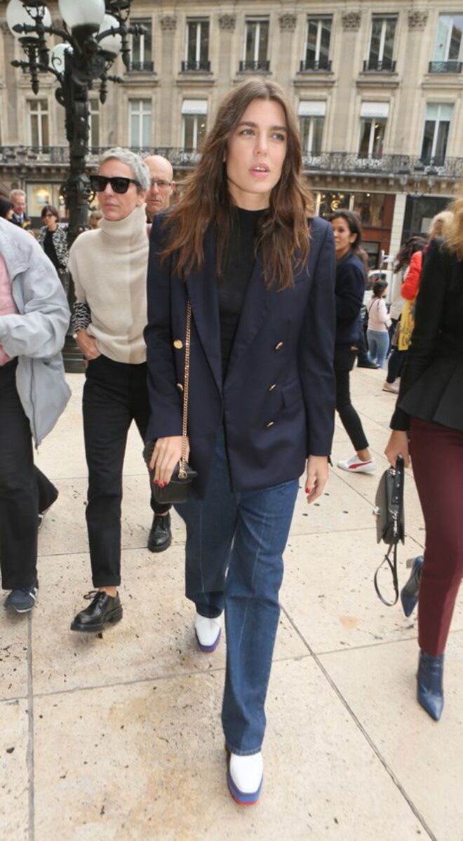 O guarda-roupa de Charlotte Casiraghi é composto maioritariamente por peças básicas, às quais a filha de Carolina do Mónaco dá um toque de modernidade. Durante a Semana da Moda de Paris, Charlotte surpreendeu com as suas opções, começando logo no desfile de Yves Saint Laurent, onde surgiu com uns calções XL em pele. Para assistir ao desfile de Stella McCartney, Charlotte voltou a brincar com a roupa e misturou um dos maiores clássicos de sempre, o blazer azul-escuro, com calças de ganga e uns sapatos que surpreenderam os mais atentos.