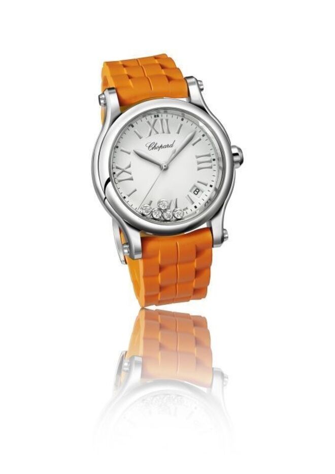 O espírito da Happy Sport recai naturalmente sobre os míticos diamantes soltos que se apresentam entre duas safiras de cristal. Dentro deste conceito, os diamantes dançam livremente dentro de um mostrador branco.