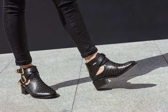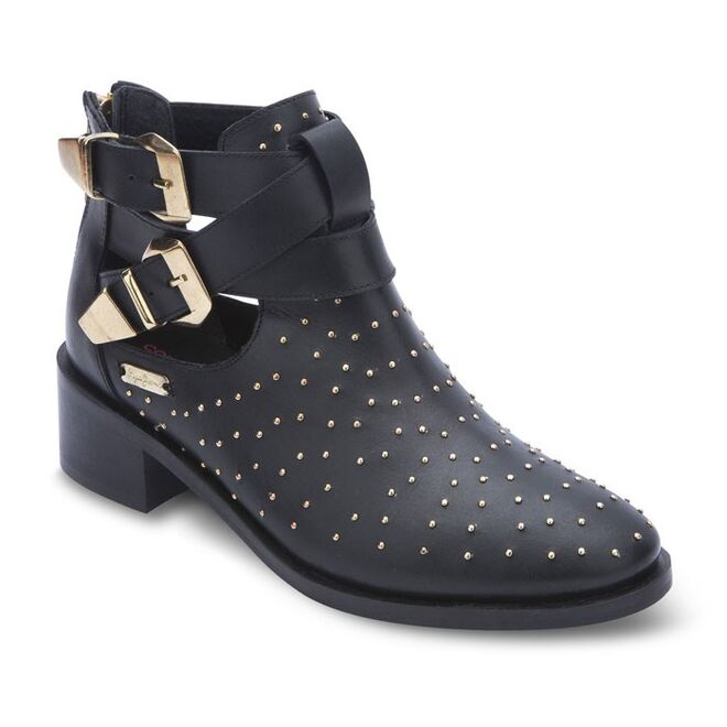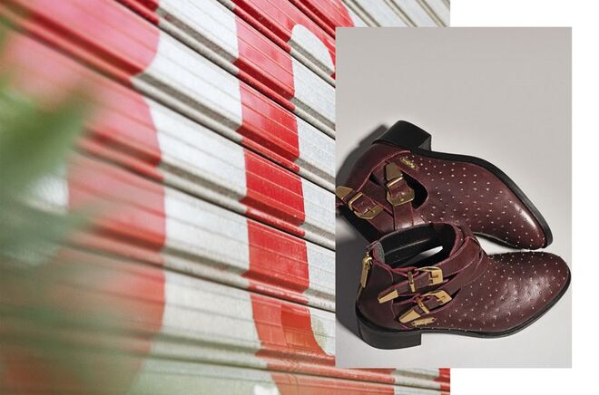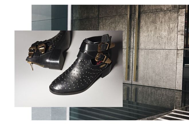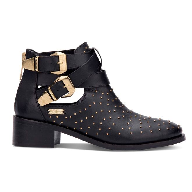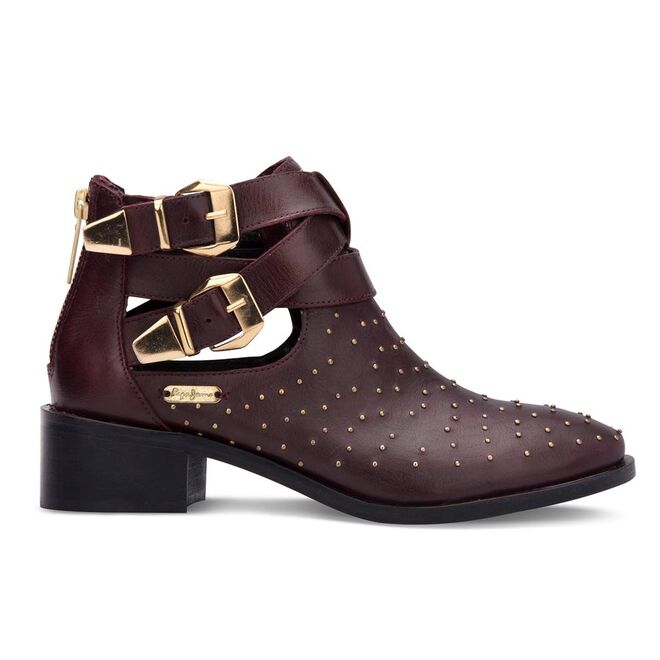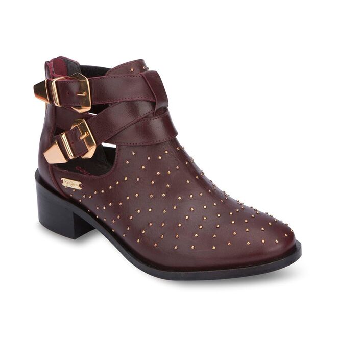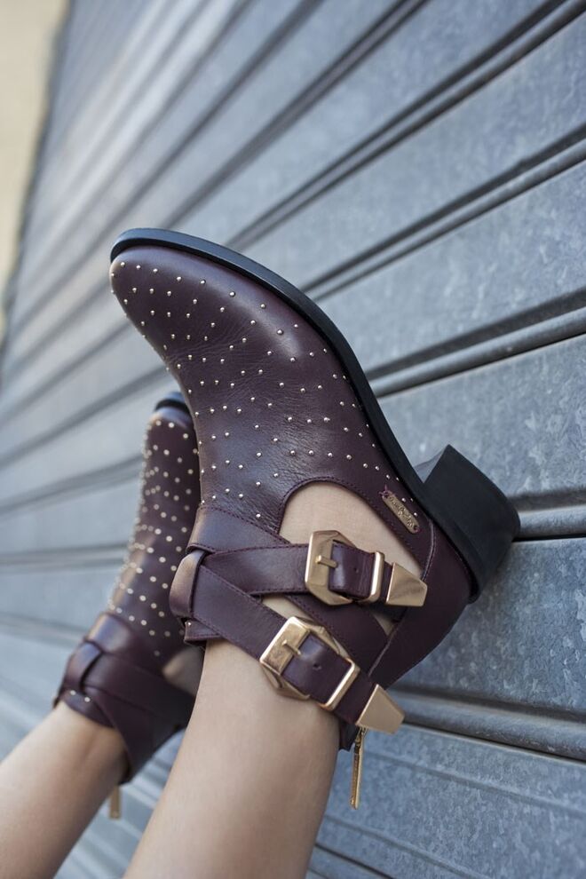 Botins curtos, com um look mais roqueiro, são feitos em pele em cor burgundy e preto, com aplicações e fivelas douradas que lhe conferem um toque de glamour.