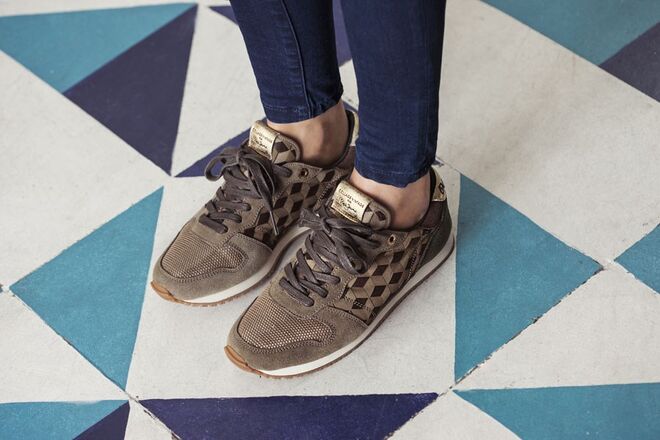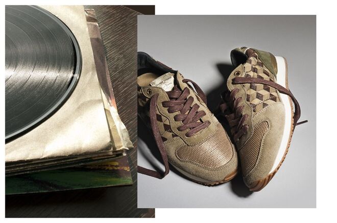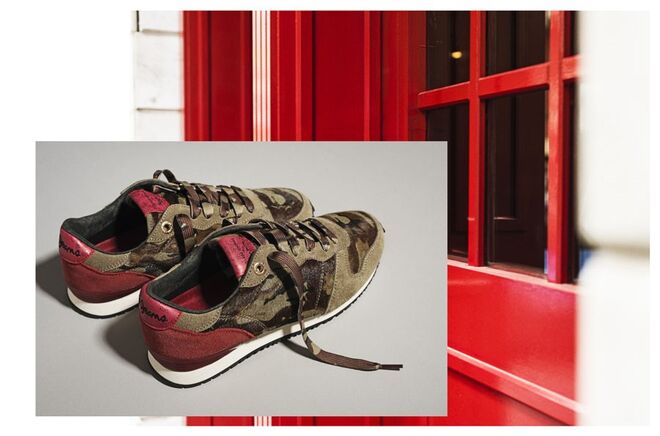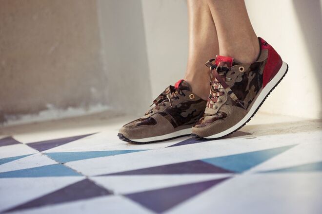 Street-runners, perfeitos para looks para sair à noite,desenhados em pele, numa combinação de cores neutras com detalhes chamativos em prints geométricos, contrastando com dourados e estampados militares com burgundy.