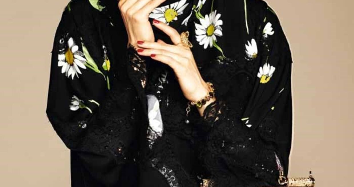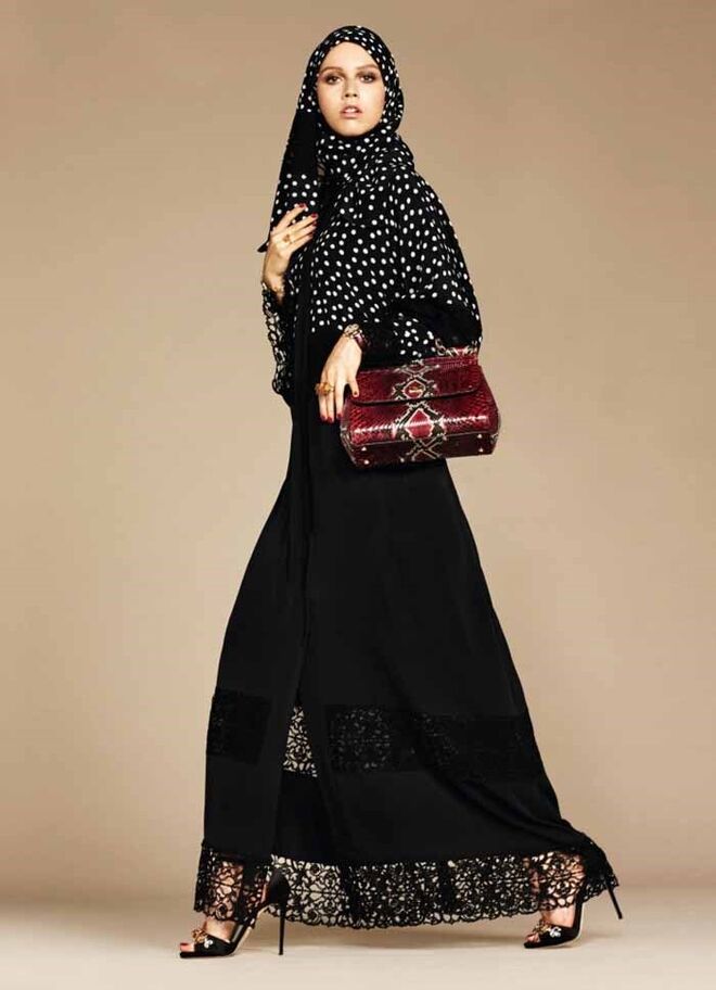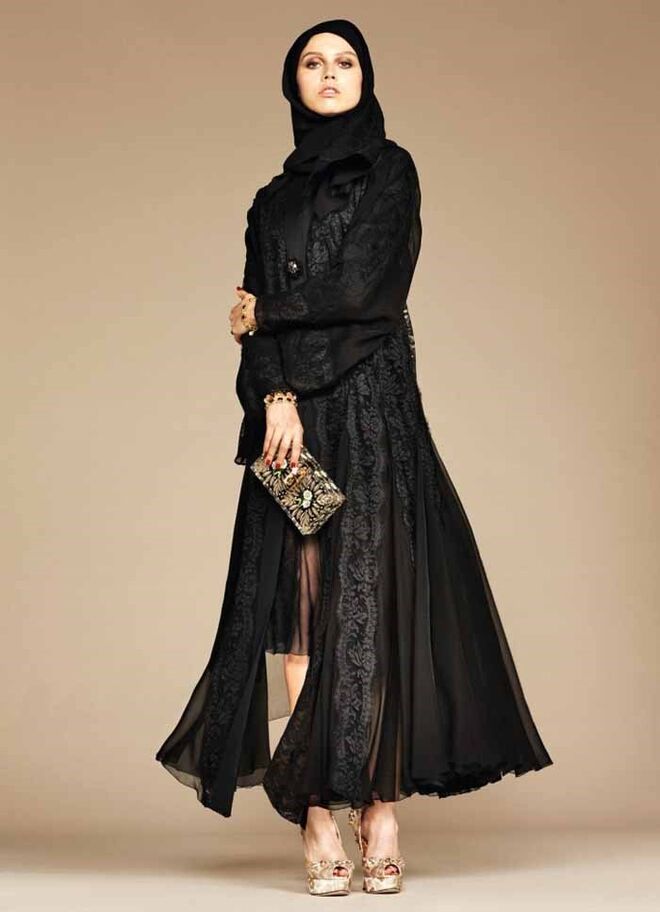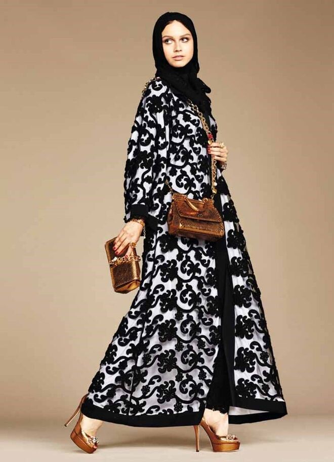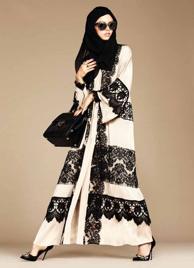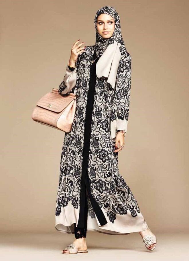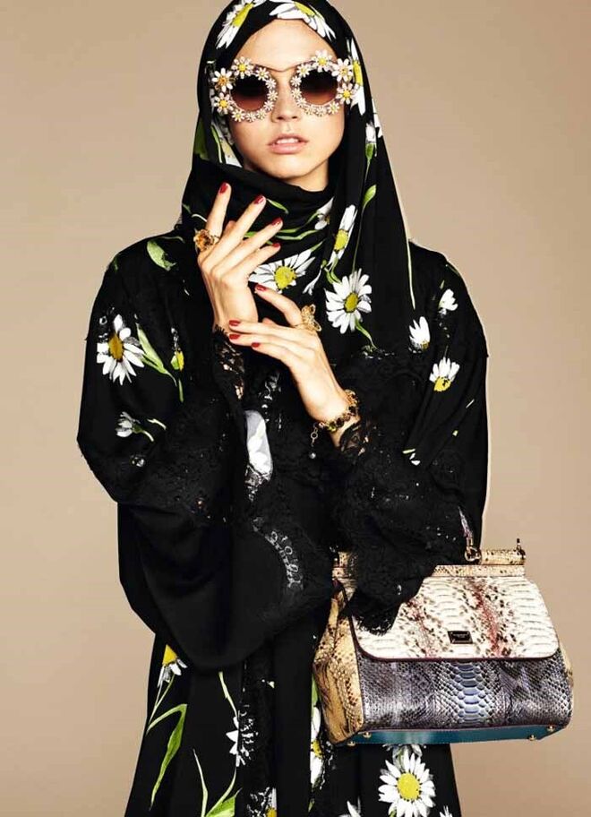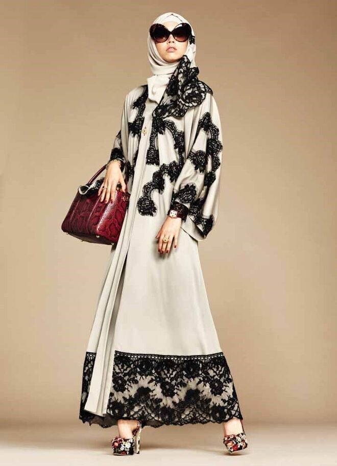 A Dolce & Gabbana acaba de lançar a sua primeira coleção de abayas e hijabs (vestidos compridos e lenços para cobrir a cabeça). Os tecidos são leves e as cores neutras: branco, tons pastel e preto. A marca transmite o seu cunho siciliano e dramático através da utilização da seda e do cetim, bem como dos pormenores em renda e dos padrões florais.