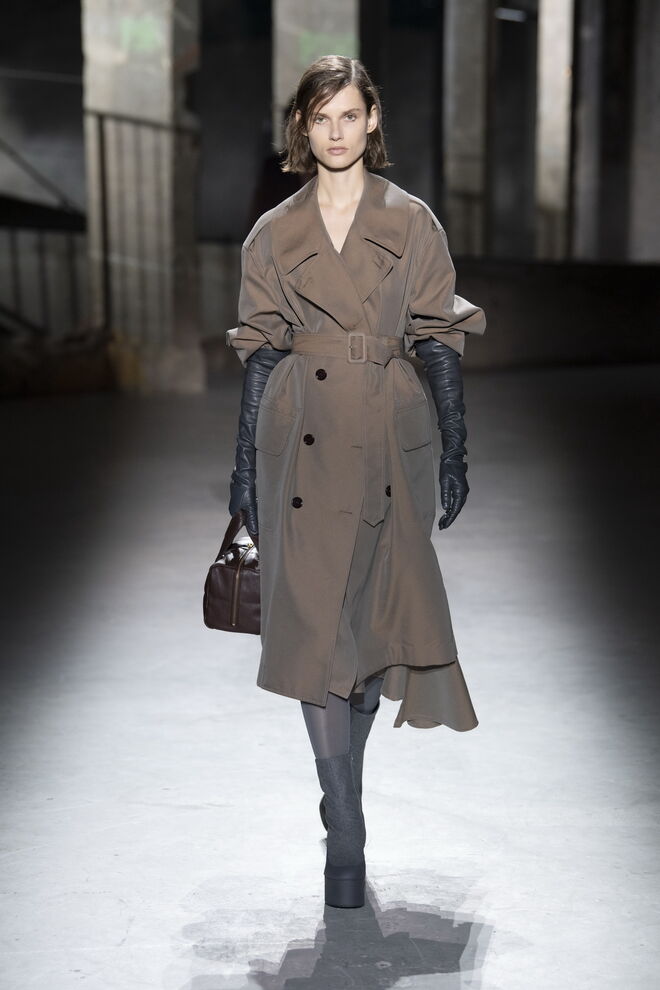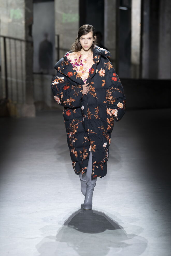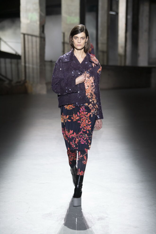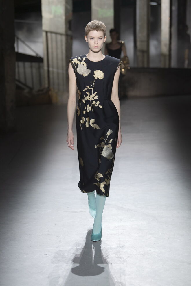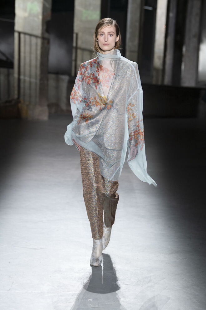 O tom do desfile foi de uma assombrosa melancolia, contrastando entre as linhas retas e cinzentas e as cores vivas e vibrantes. A imagética das flores veio do jardim da casa do designer, colhidas à mão e fotografadas para este propósito, como se estivéssemos lá. O uso de rosas, não doces e ingénuas, mas antes pesadas e complexas, serviram de espelho para os tempos atuais com todas as suas imperfeições e defeitos. Dries Van Noten inspirou-se ainda na couture dos anos 40 e 50, sobretudo nas formas masculinas.