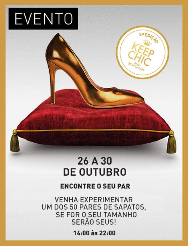 A iniciativa KEEP CHIC and be Woman pretende estimular o interesse por moda, que estará em destaque em todo o centro comercial, especialmente para as apaixonadas por sapatos. A iniciativa passou já pelo Parque Nascente, de 19 a 23 de outubro, e pelo Aqua Portimão, de 26 a 30 de outubro, sendo esta a última oportunidade para as interessadas tentarem a sua sorte e levarem para casa um par de sapatos.