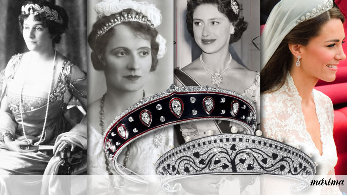 A tiara Halo (em platina e diamantes, 1936) percorreu 75 anos de história na família real inglesa até chegar à cabeça de Kate Middleton no dia do seu casamento com o príncipe William, em abril de 2011.