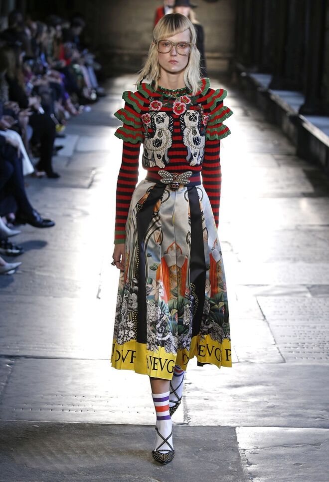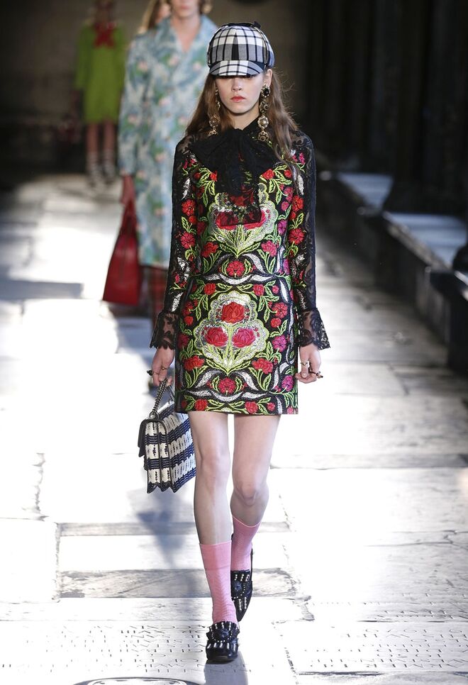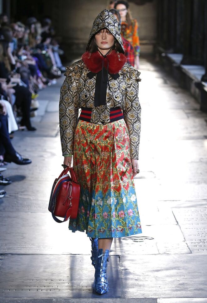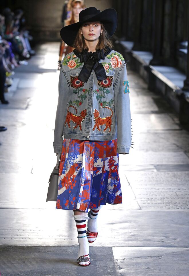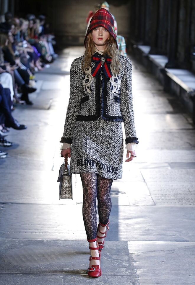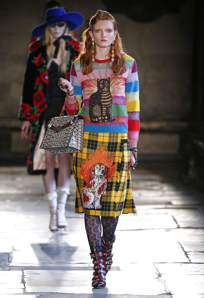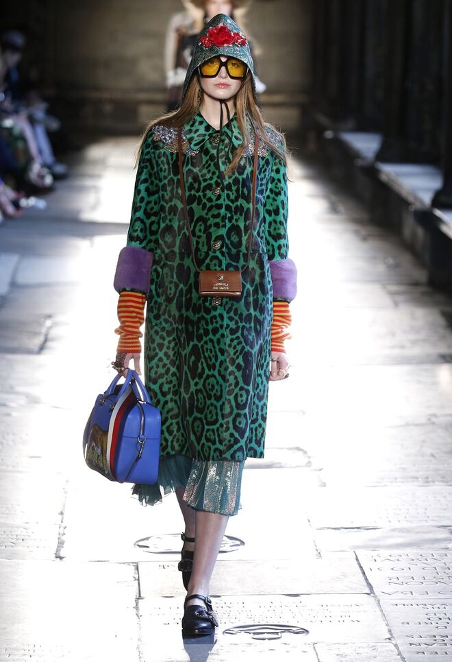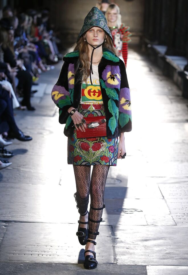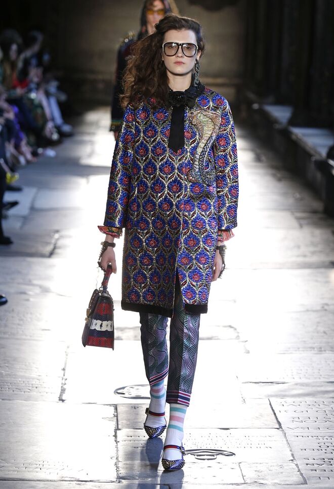 Arrojada e colorida. É a primeira impressão da nova criação do designer Alessandro Michele para a Gucci, uma proposta para a coleção Cruise. A multiplicidade de padrões é proporcional à quantidade de materiais, das rendas ao glitter, dos bordados ao chiffon, da seda ao pêlo. Muitos deles incorporados numa só peça. Saltam à vista as peças com estampados florais e geométricos, os casacos compridos com padrões fortes, o denim bordados com animal print ou mesmo leões, cobras e gatos, e tons novos como o verde água, o rosa salmão, o azul celeste ou o verde esmeralda. O lettering surge em alguns coordenados, com frases como "blind for love", e a alusão à bandeira inglesa surge num ou noutro pormenor. O calçado enche-se de detalhes, como pérolas ou chapas, tiras com presilhas, e os icónicos mary-janes voltam na próxima estação fria.