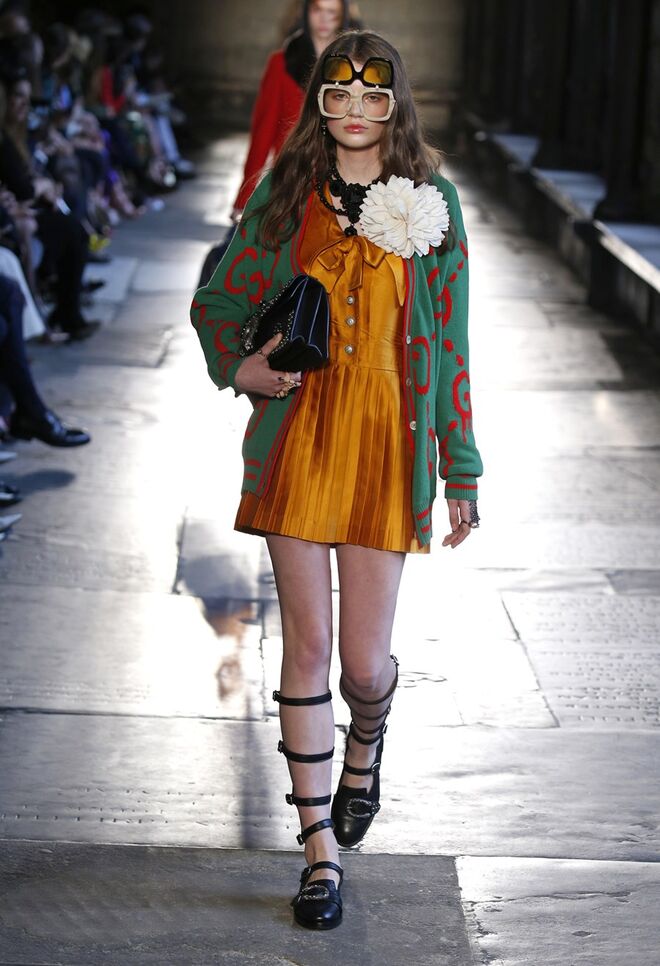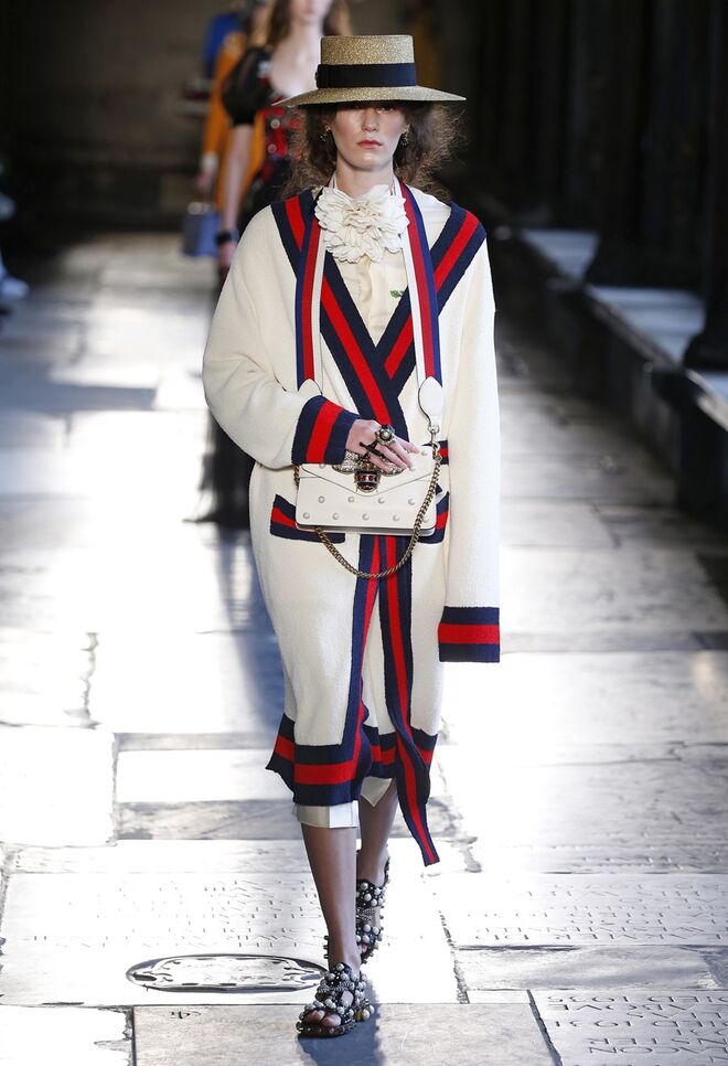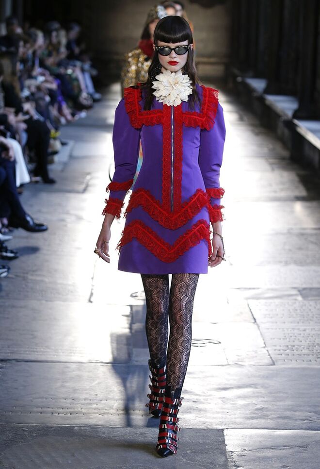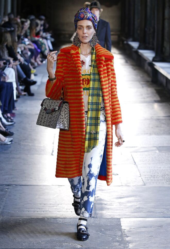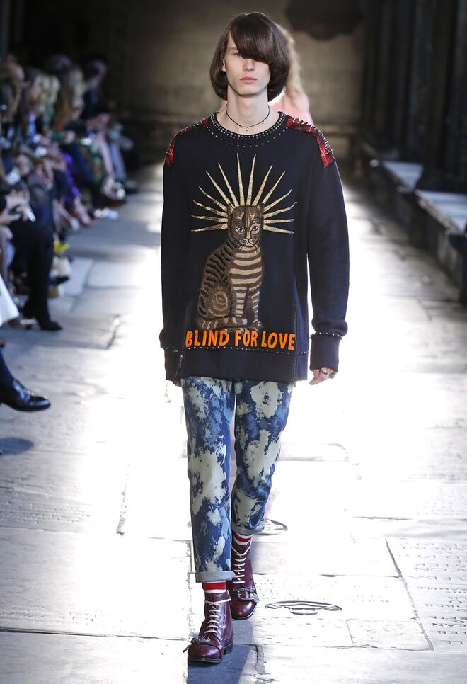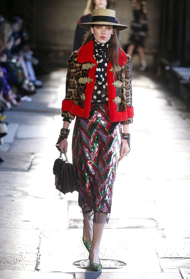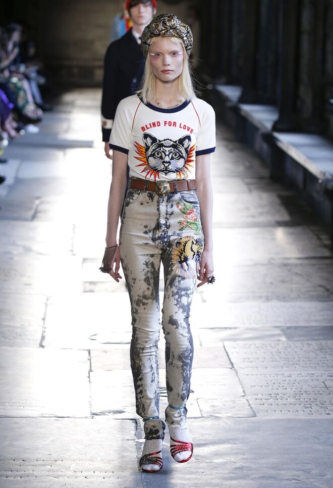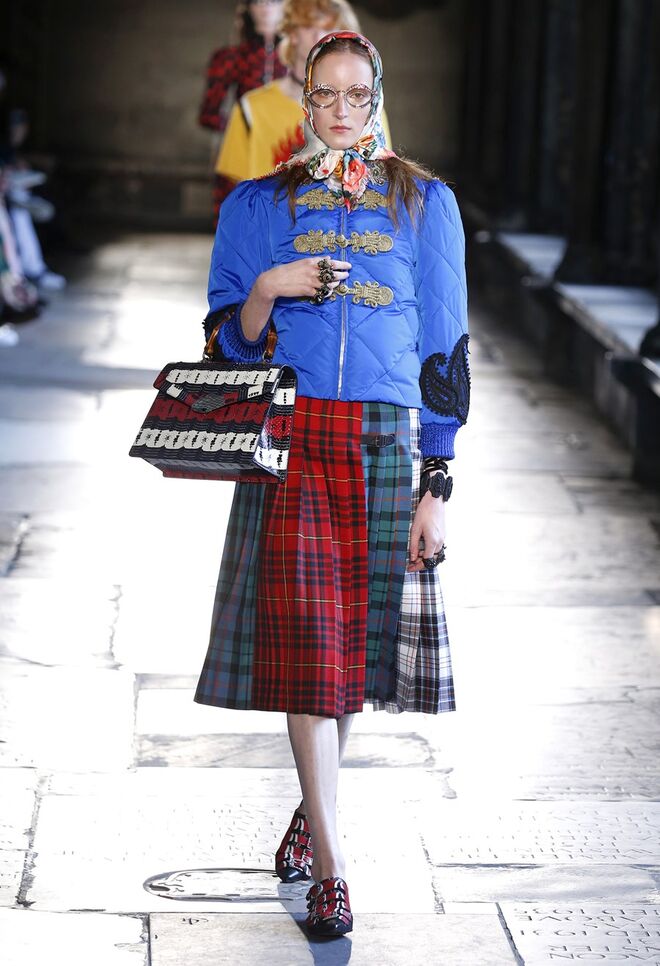 Arrojada e colorida. É a primeira impressão da nova criação do designer Alessandro Michele para a Gucci, uma proposta para a coleção Cruise. A multiplicidade de padrões é proporcional à quantidade de materiais, das rendas ao glitter, dos bordados ao chiffon, da seda ao pêlo. Muitos deles incorporados numa só peça. Saltam à vista as peças com estampados florais e geométricos, os casacos compridos com padrões fortes, o denim bordados com animal print ou mesmo leões, cobras e gatos, e tons novos como o verde água, o rosa salmão, o azul celeste ou o verde esmeralda. O lettering surge em alguns coordenados, com frases como "blind for love", e a alusão à bandeira inglesa surge num ou noutro pormenor. O calçado enche-se de detalhes, como pérolas ou chapas, tiras com presilhas, e os icónicos mary-janes voltam na próxima estação fria.