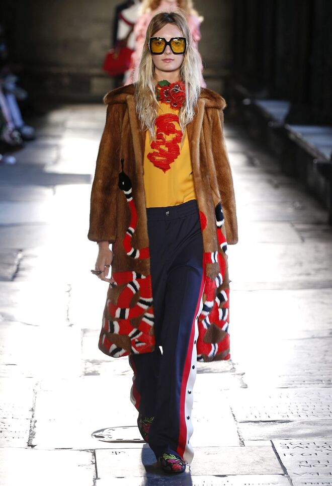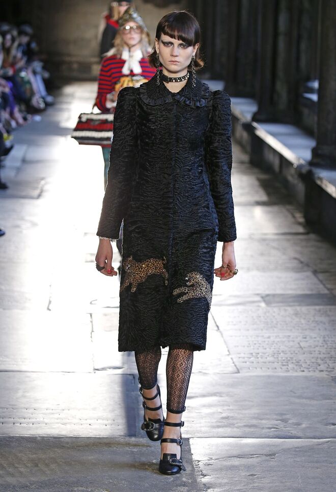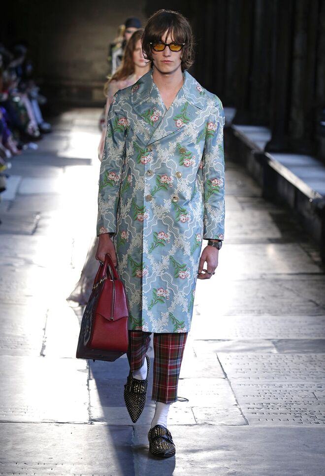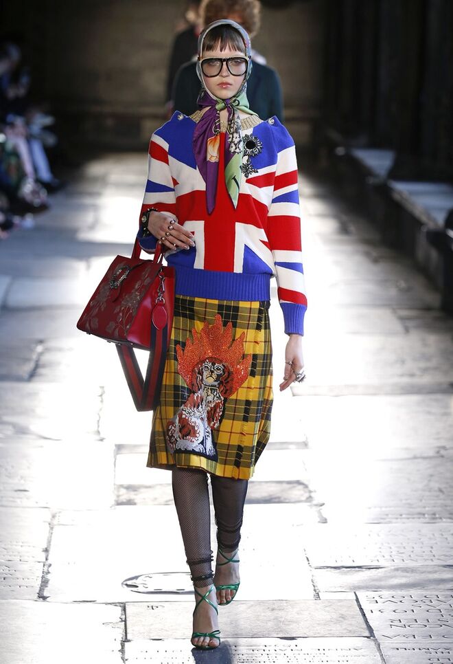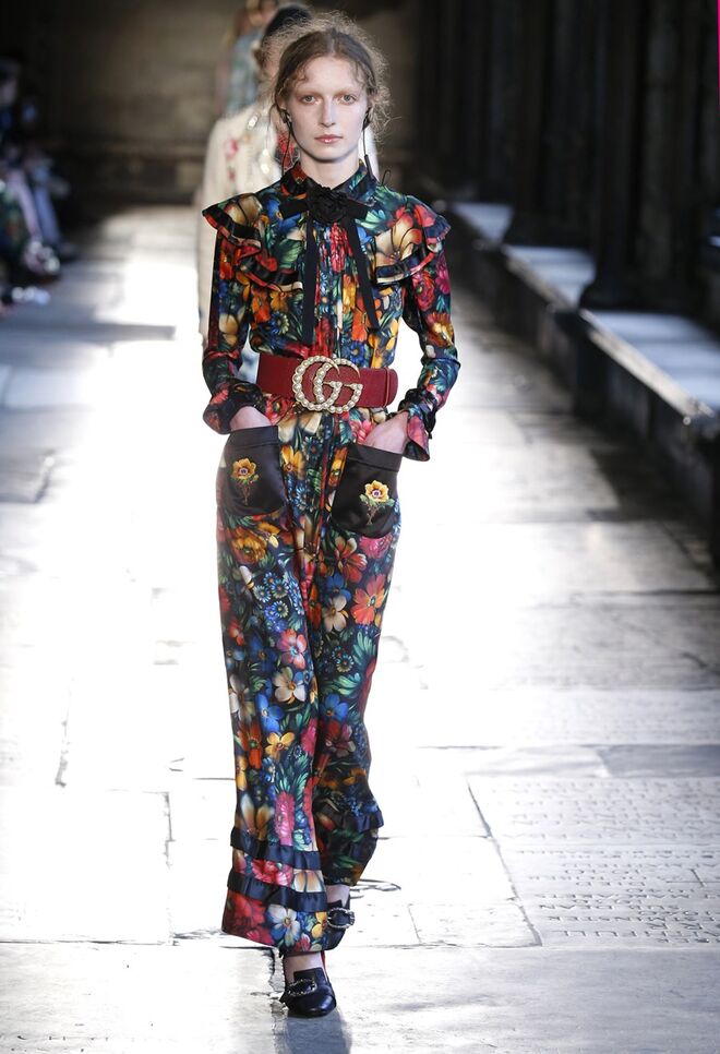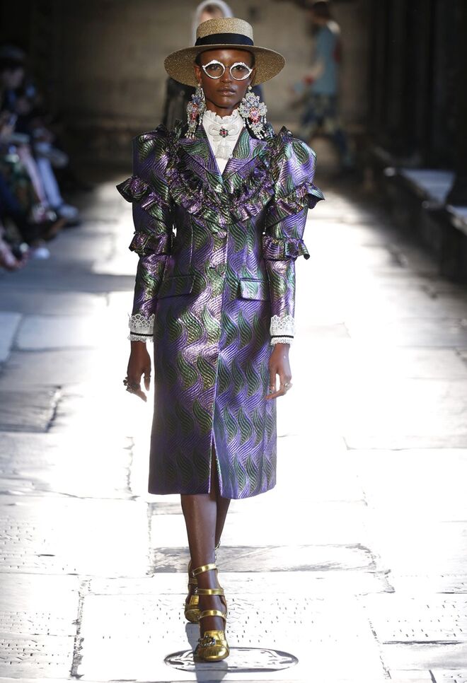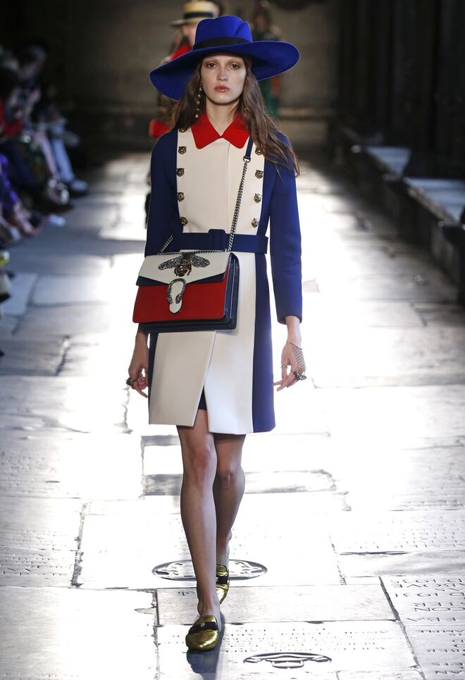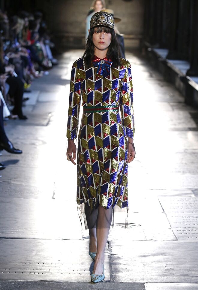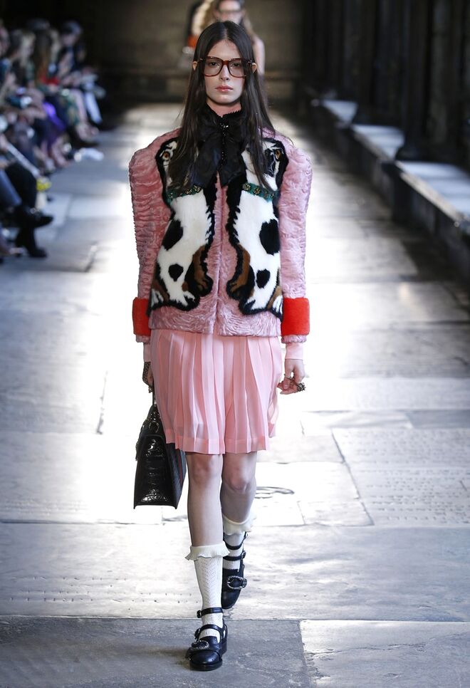 Arrojada e colorida. É a primeira impressão da nova criação do designer Alessandro Michele para a Gucci, uma proposta para a coleção Cruise. A multiplicidade de padrões é proporcional à quantidade de materiais, das rendas ao glitter, dos bordados ao chiffon, da seda ao pêlo. Muitos deles incorporados numa só peça. Saltam à vista as peças com estampados florais e geométricos, os casacos compridos com padrões fortes, o denim bordados com animal print ou mesmo leões, cobras e gatos, e tons novos como o verde água, o rosa salmão, o azul celeste ou o verde esmeralda. O lettering surge em alguns coordenados, com frases como "blind for love", e a alusão à bandeira inglesa surge num ou noutro pormenor. O calçado enche-se de detalhes, como pérolas ou chapas, tiras com presilhas, e os icónicos mary-janes voltam na próxima estação fria.