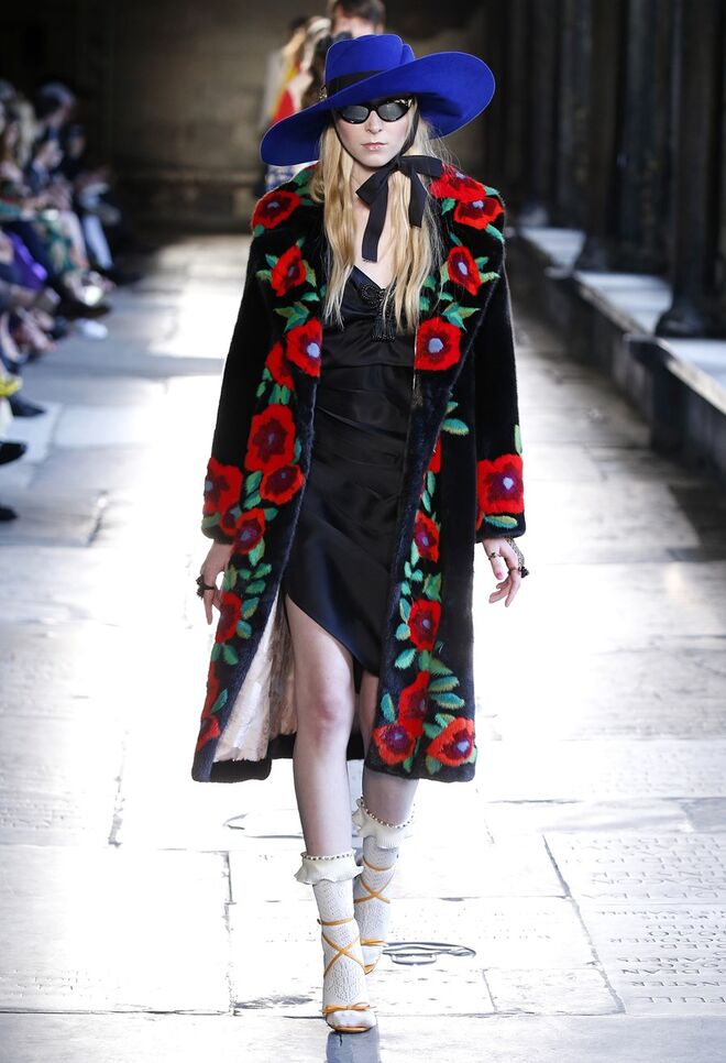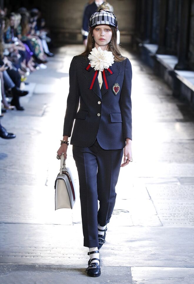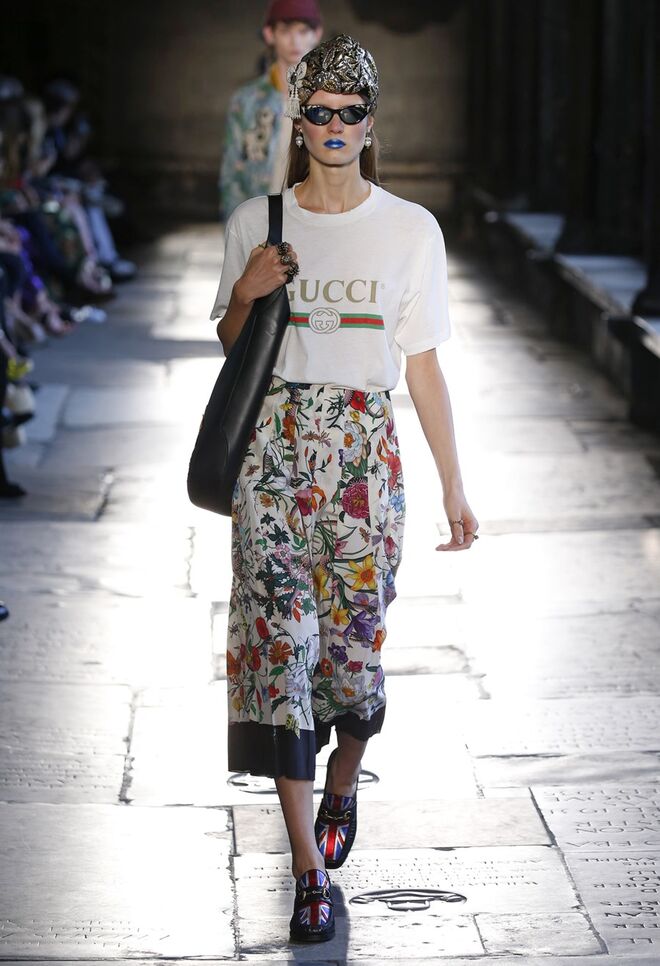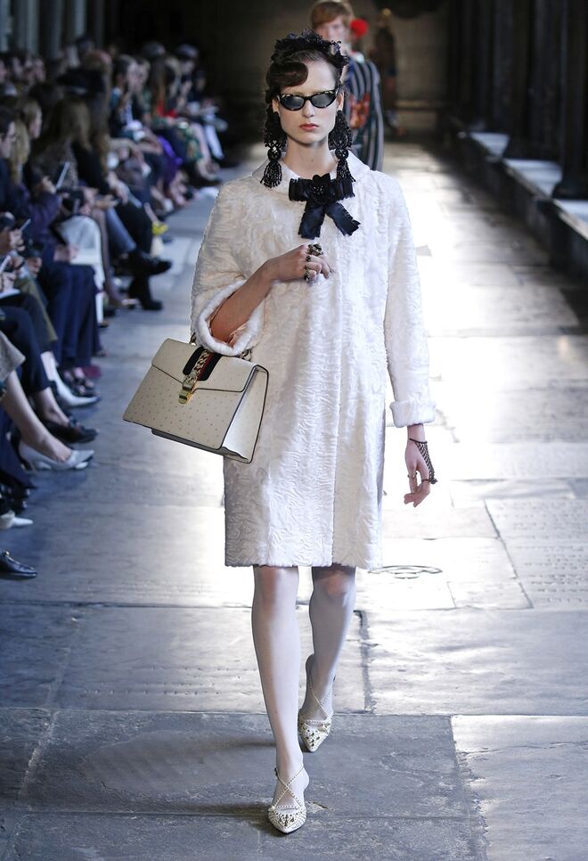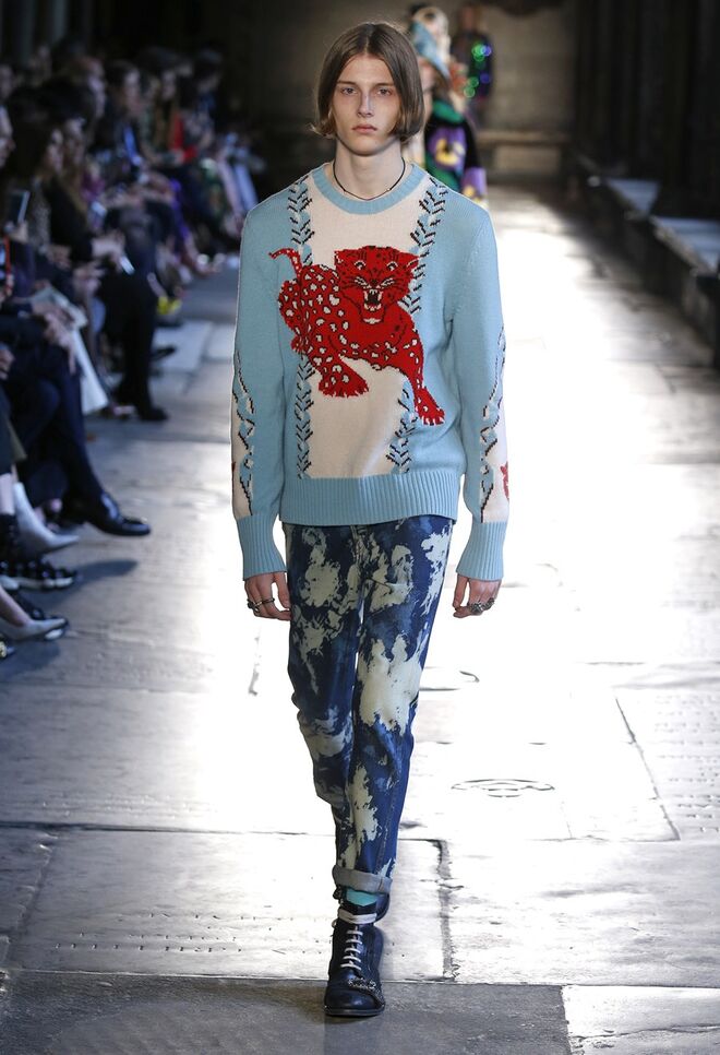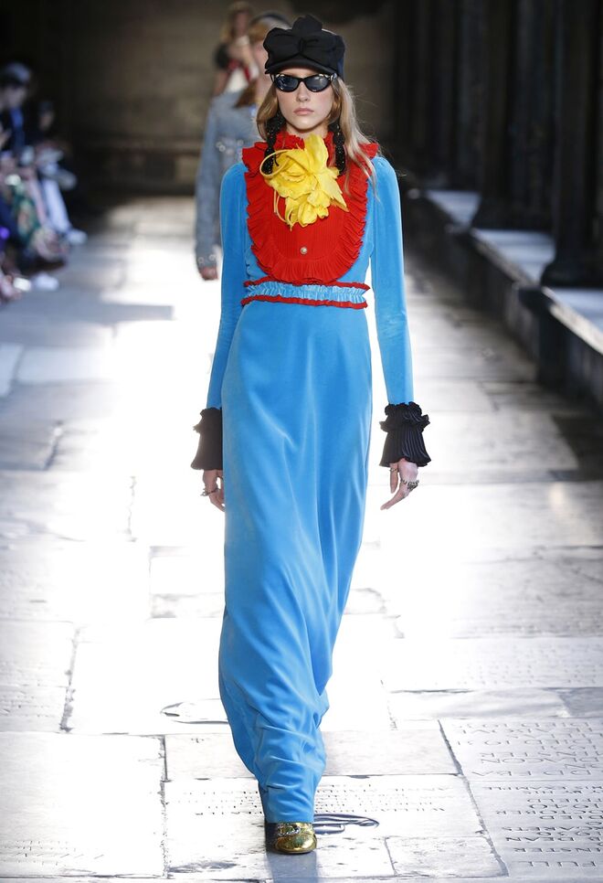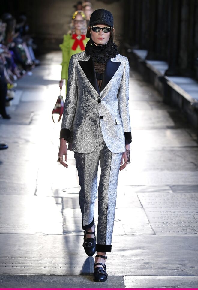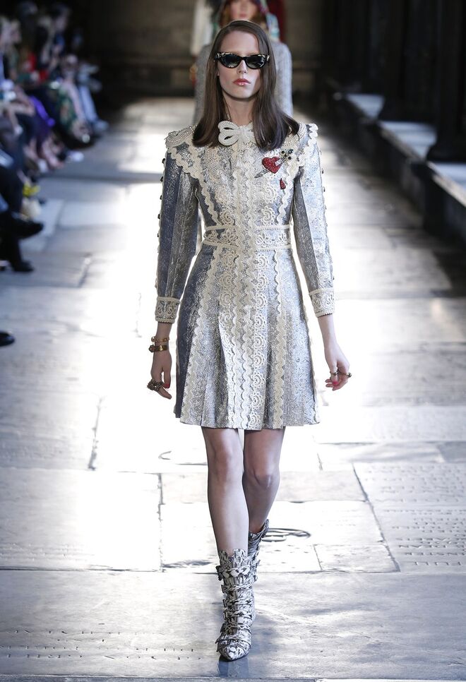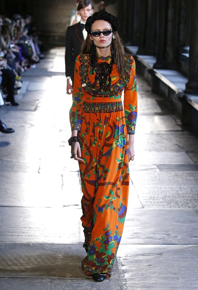 Arrojada e colorida. É a primeira impressão da nova criação do designer Alessandro Michele para a Gucci, uma proposta para a coleção Cruise. A multiplicidade de padrões é proporcional à quantidade de materiais, das rendas ao glitter, dos bordados ao chiffon, da seda ao pêlo. Muitos deles incorporados numa só peça. Saltam à vista as peças com estampados florais e geométricos, os casacos compridos com padrões fortes, o denim bordados com animal print ou mesmo leões, cobras e gatos, e tons novos como o verde água, o rosa salmão, o azul celeste ou o verde esmeralda. O lettering surge em alguns coordenados, com frases como "blind for love", e a alusão à bandeira inglesa surge num ou noutro pormenor. O calçado enche-se de detalhes, como pérolas ou chapas, tiras com presilhas, e os icónicos mary-janes voltam na próxima estação fria.