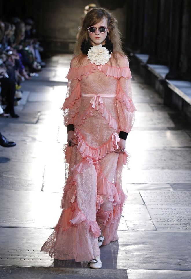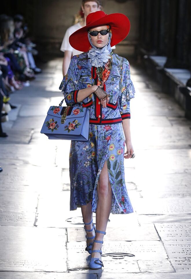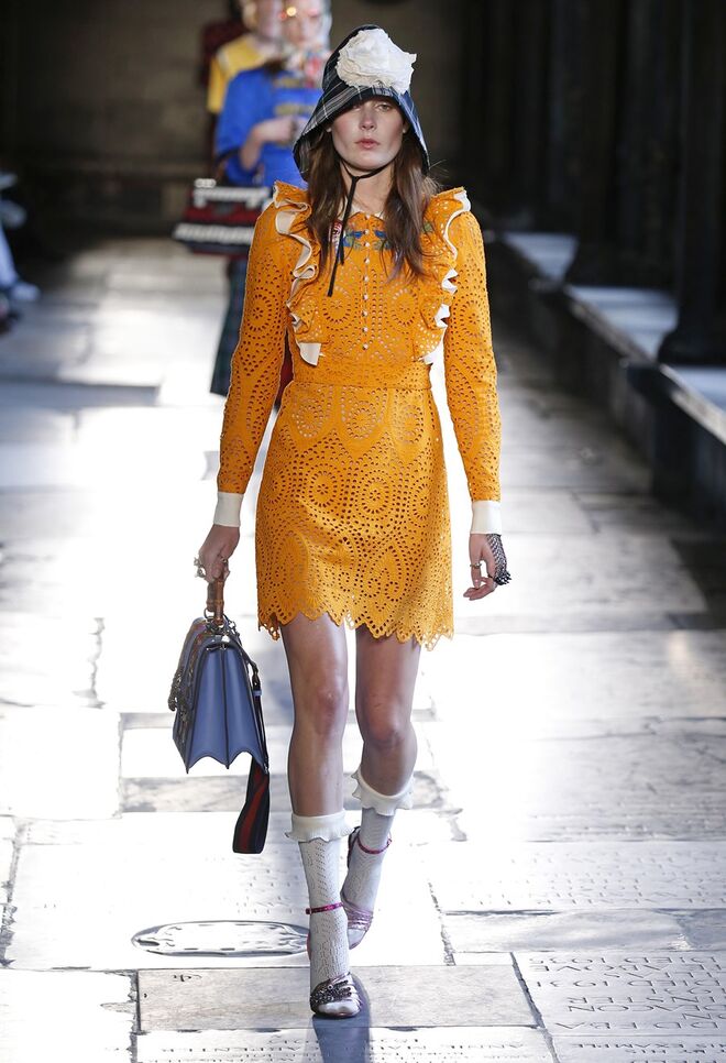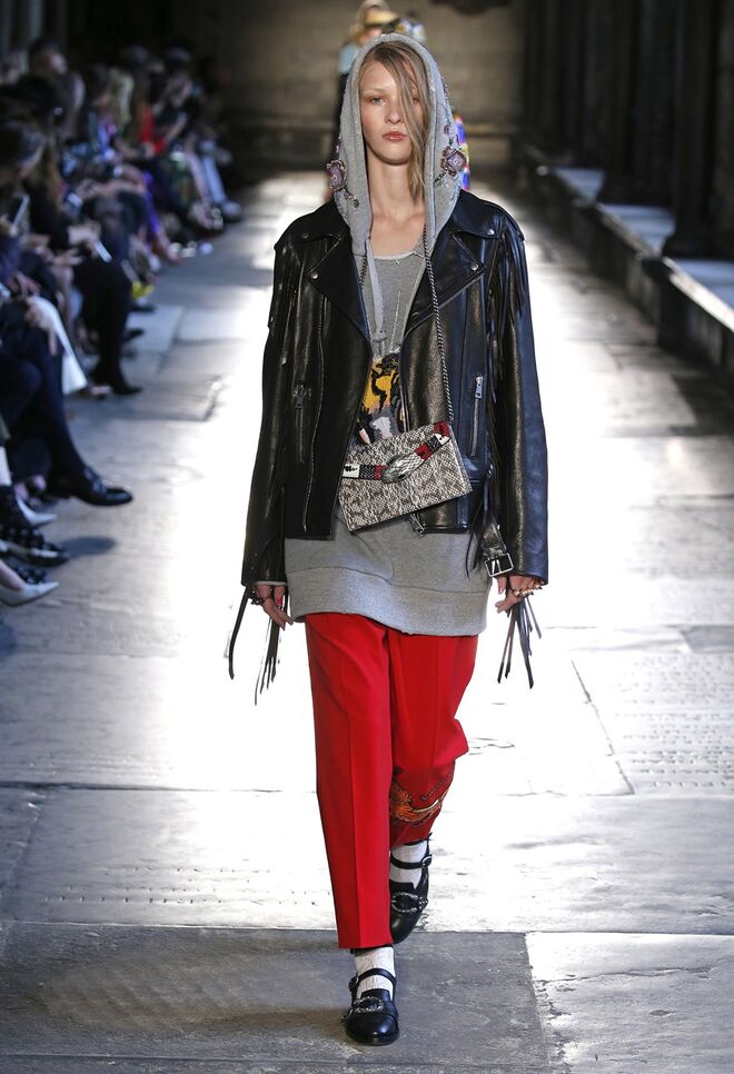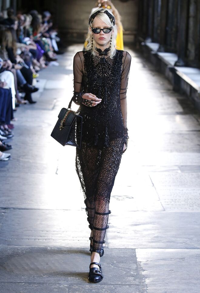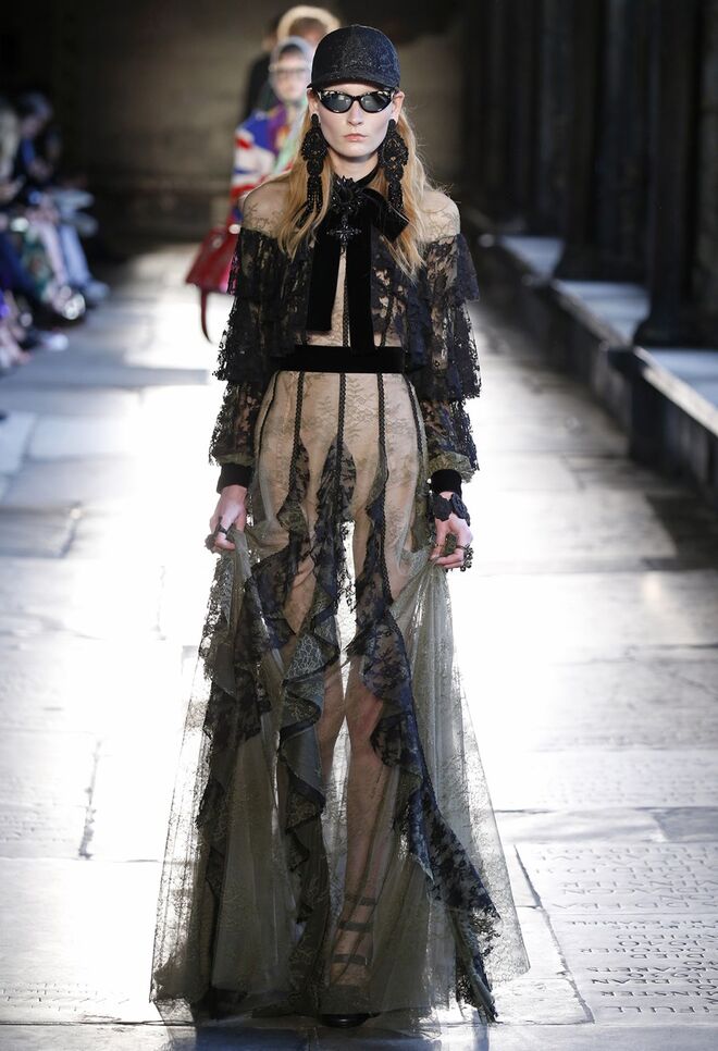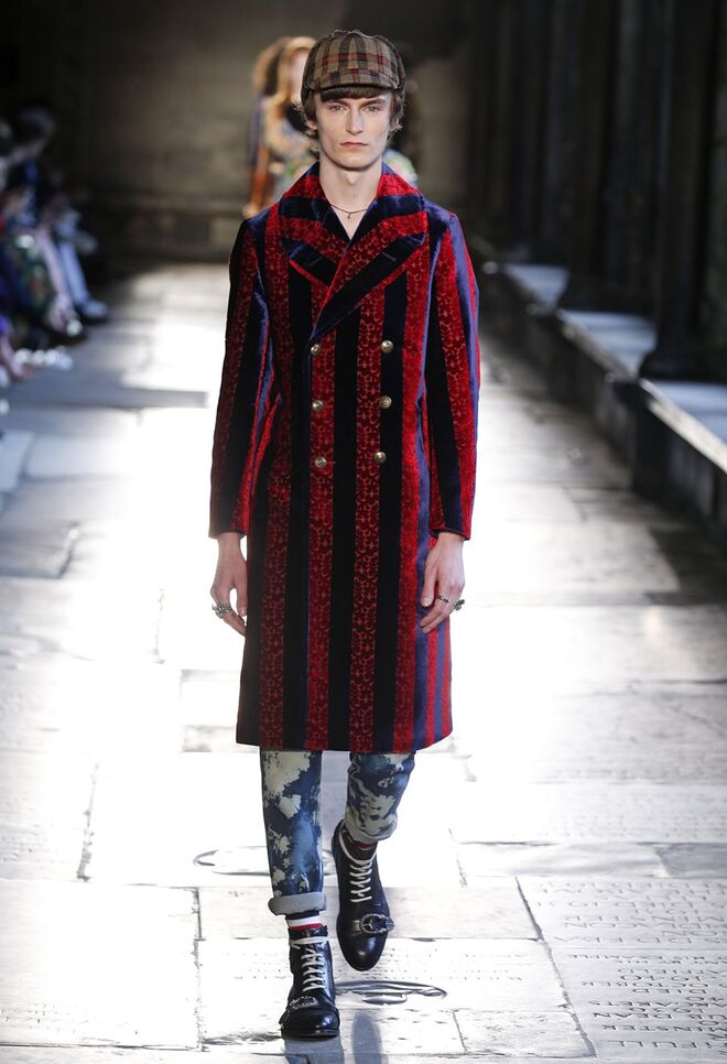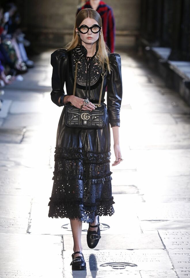 Arrojada e colorida. É a primeira impressão da nova criação do designer Alessandro Michele para a Gucci, uma proposta para a coleção Cruise. A multiplicidade de padrões é proporcional à quantidade de materiais, das rendas ao glitter, dos bordados ao chiffon, da seda ao pêlo. Muitos deles incorporados numa só peça. Saltam à vista as peças com estampados florais e geométricos, os casacos compridos com padrões fortes, o denim bordados com animal print ou mesmo leões, cobras e gatos, e tons novos como o verde água, o rosa salmão, o azul celeste ou o verde esmeralda. O lettering surge em alguns coordenados, com frases como "blind for love", e a alusão à bandeira inglesa surge num ou noutro pormenor. O calçado enche-se de detalhes, como pérolas ou chapas, tiras com presilhas, e os icónicos mary-janes voltam na próxima estação fria.