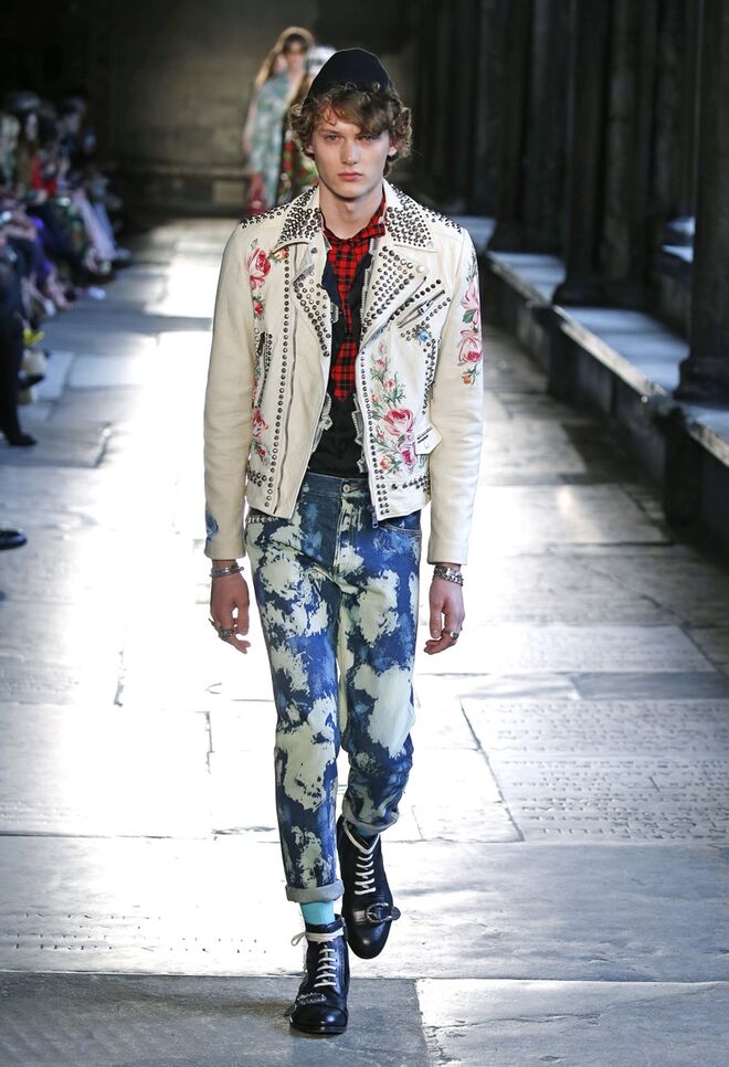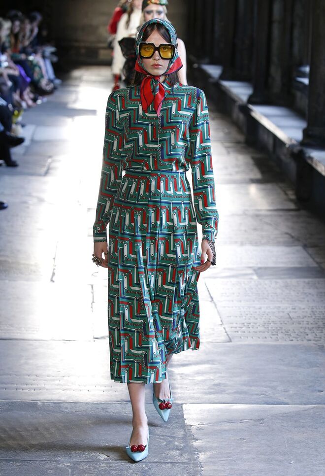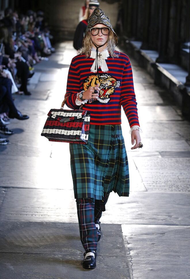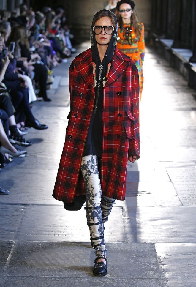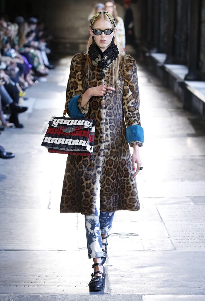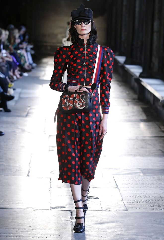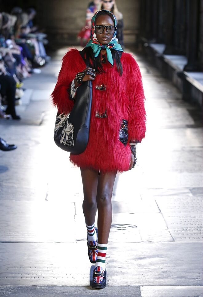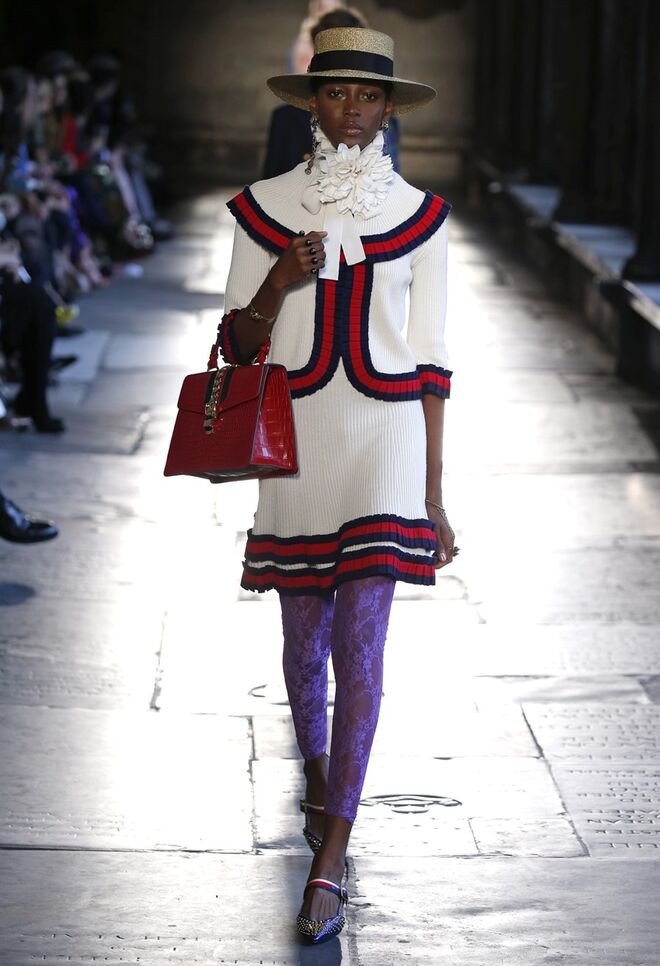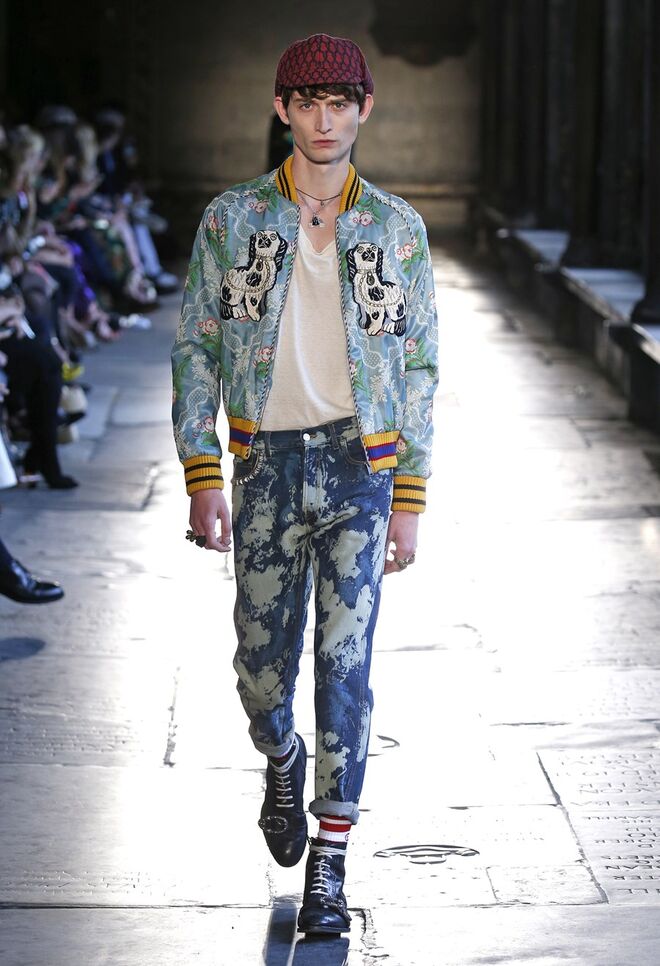 Arrojada e colorida. É a primeira impressão da nova criação do designer Alessandro Michele para a Gucci, uma proposta para a coleção Cruise. A multiplicidade de padrões é proporcional à quantidade de materiais, das rendas ao glitter, dos bordados ao chiffon, da seda ao pêlo. Muitos deles incorporados numa só peça. Saltam à vista as peças com estampados florais e geométricos, os casacos compridos com padrões fortes, o denim bordados com animal print ou mesmo leões, cobras e gatos, e tons novos como o verde água, o rosa salmão, o azul celeste ou o verde esmeralda. O lettering surge em alguns coordenados, com frases como "blind for love", e a alusão à bandeira inglesa surge num ou noutro pormenor. O calçado enche-se de detalhes, como pérolas ou chapas, tiras com presilhas, e os icónicos mary-janes voltam na próxima estação fria.