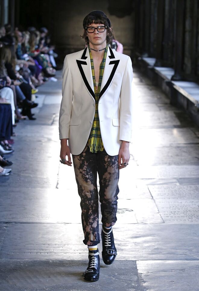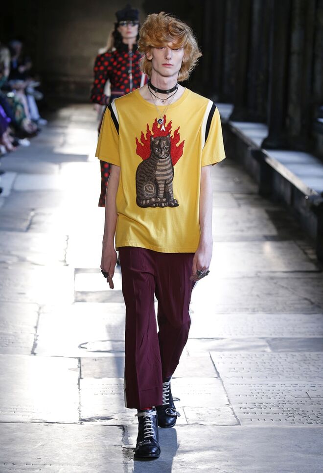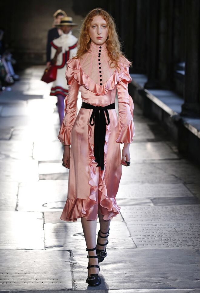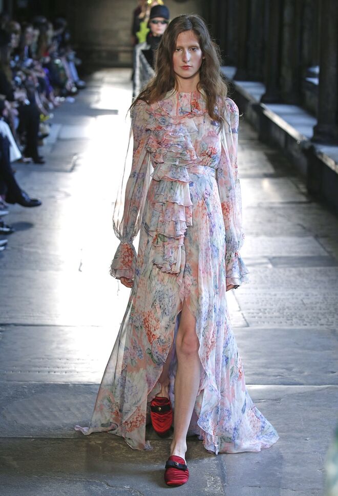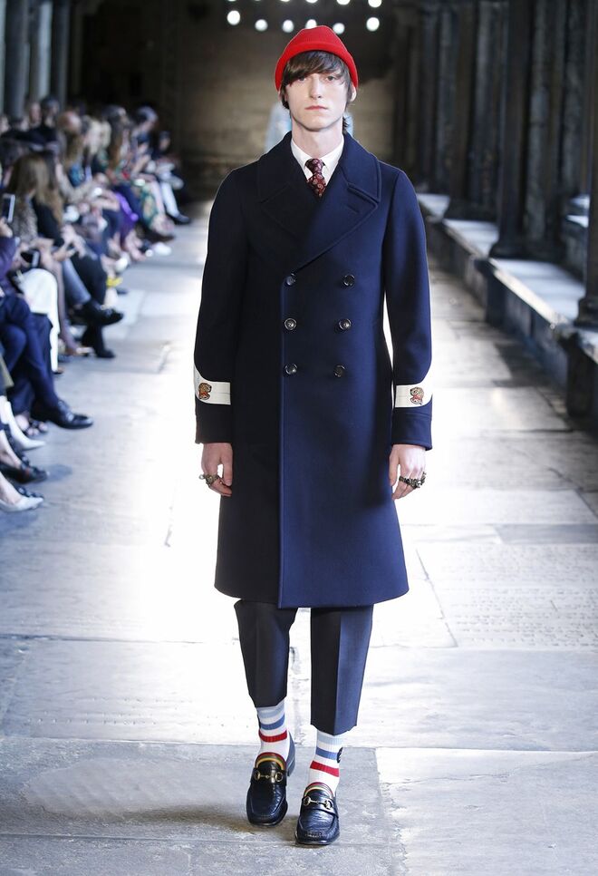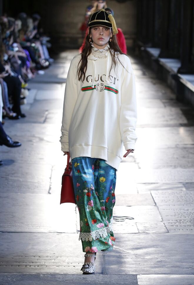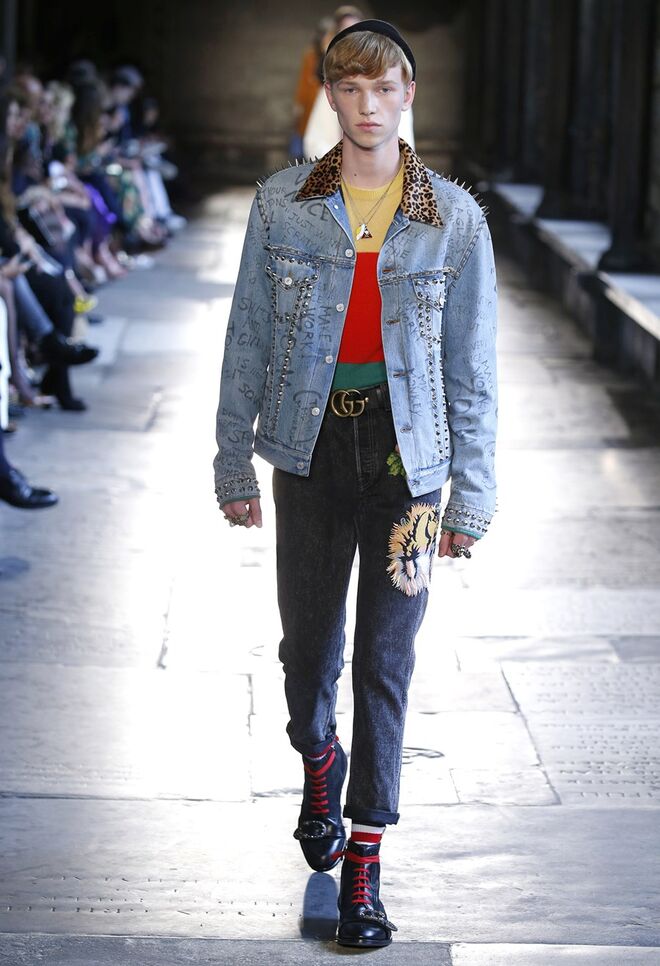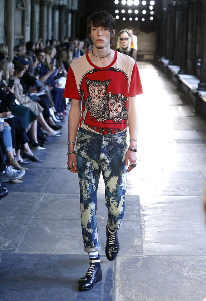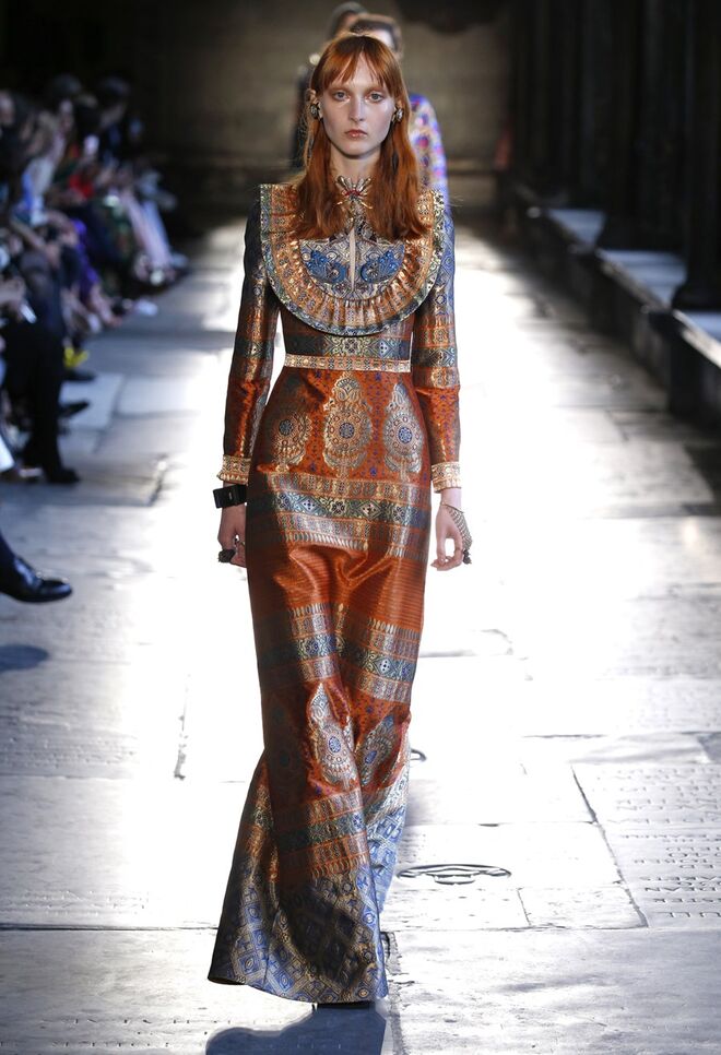 Arrojada e colorida. É a primeira impressão da nova criação do designer Alessandro Michele para a Gucci, uma proposta para a coleção Cruise. A multiplicidade de padrões é proporcional à quantidade de materiais, das rendas ao glitter, dos bordados ao chiffon, da seda ao pêlo. Muitos deles incorporados numa só peça. Saltam à vista as peças com estampados florais e geométricos, os casacos compridos com padrões fortes, o denim bordados com animal print ou mesmo leões, cobras e gatos, e tons novos como o verde água, o rosa salmão, o azul celeste ou o verde esmeralda. O lettering surge em alguns coordenados, com frases como "blind for love", e a alusão à bandeira inglesa surge num ou noutro pormenor. O calçado enche-se de detalhes, como pérolas ou chapas, tiras com presilhas, e os icónicos mary-janes voltam na próxima estação fria.