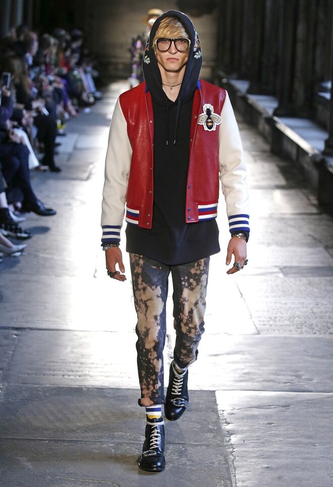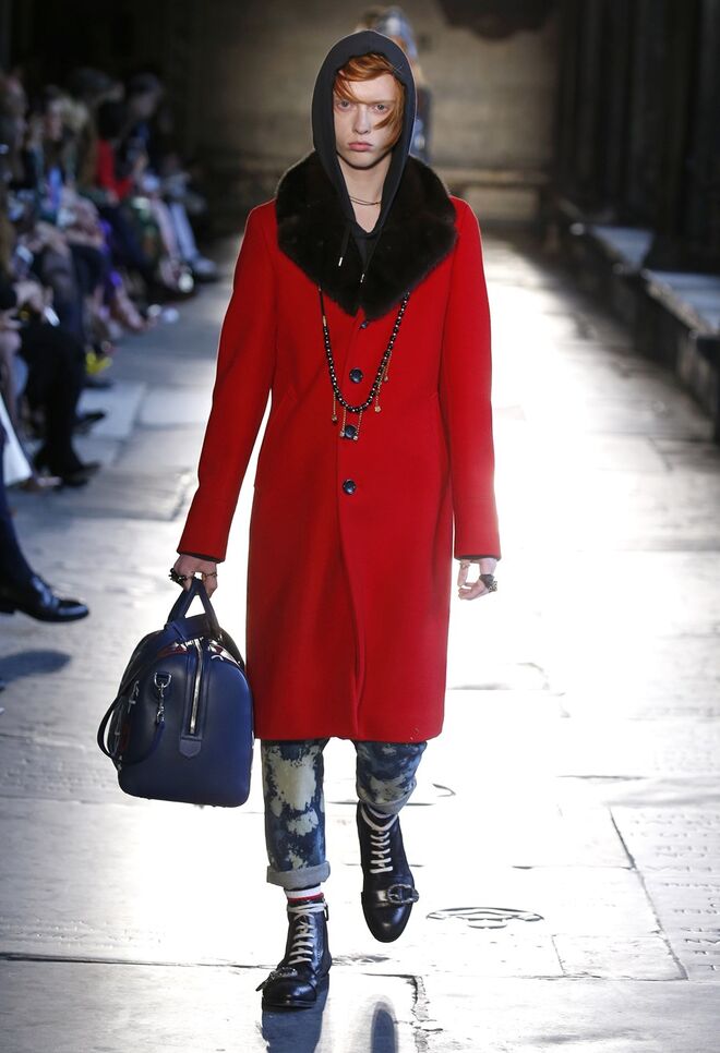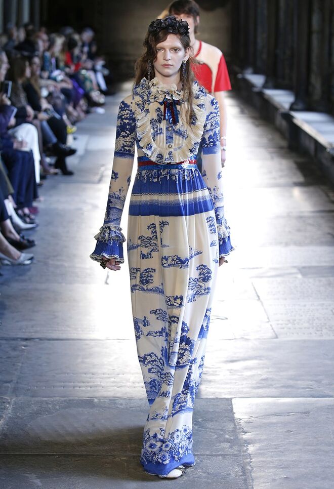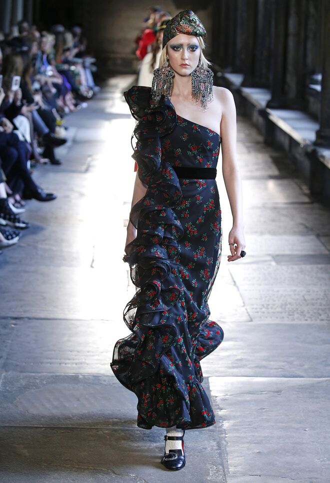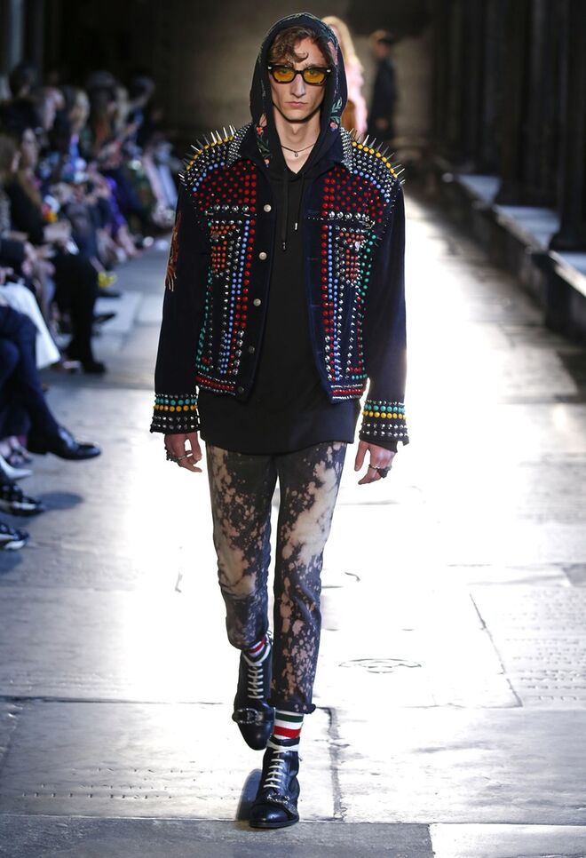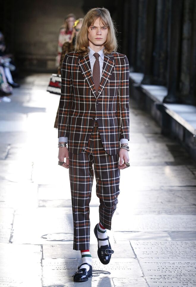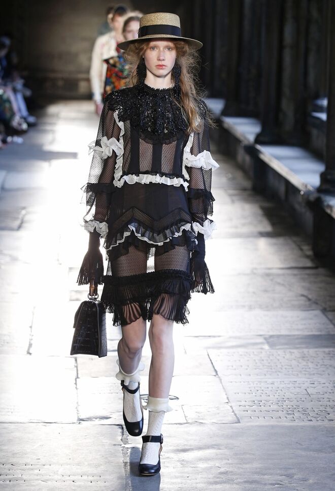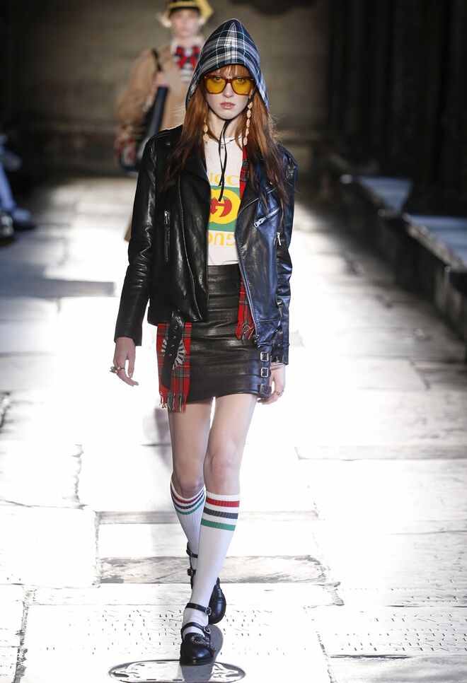 Arrojada e colorida. É a primeira impressão da nova criação do designer Alessandro Michele para a Gucci, uma proposta para a coleção Cruise. A multiplicidade de padrões é proporcional à quantidade de materiais, das rendas ao glitter, dos bordados ao chiffon, da seda ao pêlo. Muitos deles incorporados numa só peça. Saltam à vista as peças com estampados florais e geométricos, os casacos compridos com padrões fortes, o denim bordados com animal print ou mesmo leões, cobras e gatos, e tons novos como o verde água, o rosa salmão, o azul celeste ou o verde esmeralda. O lettering surge em alguns coordenados, com frases como "blind for love", e a alusão à bandeira inglesa surge num ou noutro pormenor. O calçado enche-se de detalhes, como pérolas ou chapas, tiras com presilhas, e os icónicos mary-janes voltam na próxima estação fria.