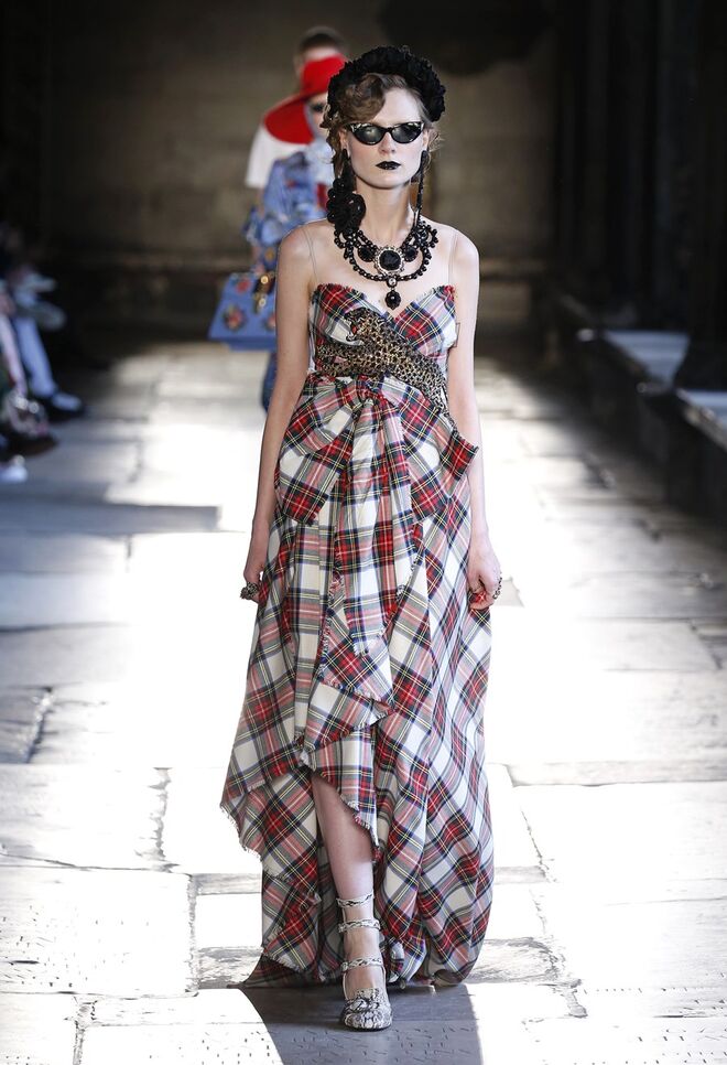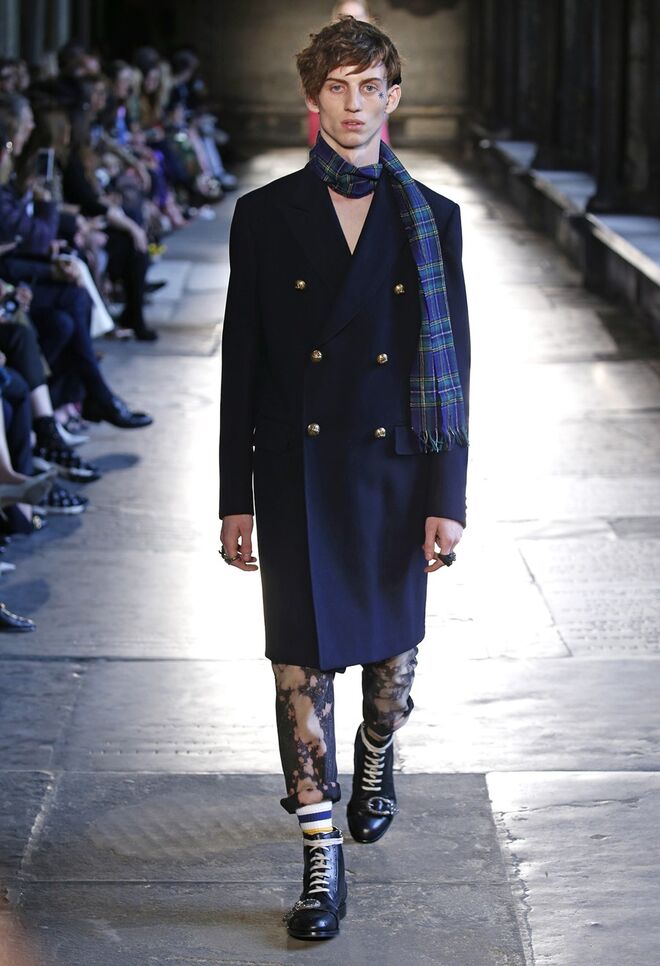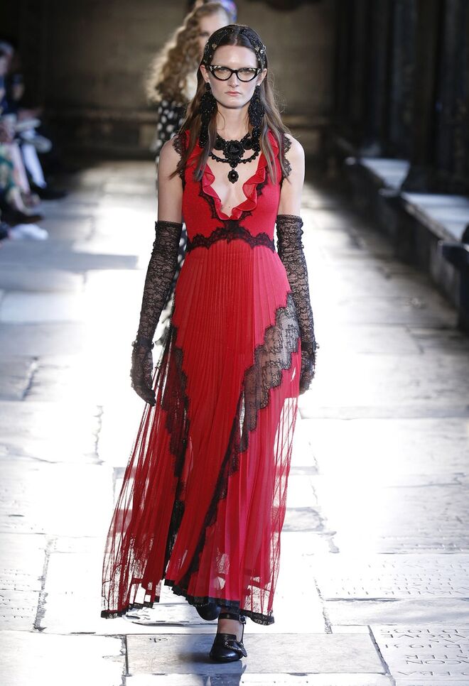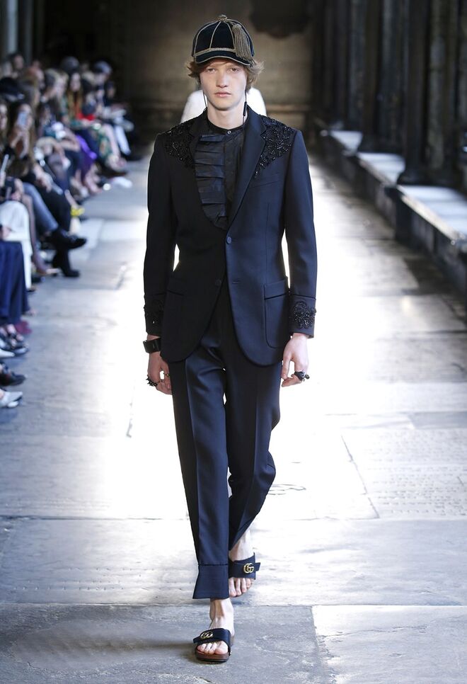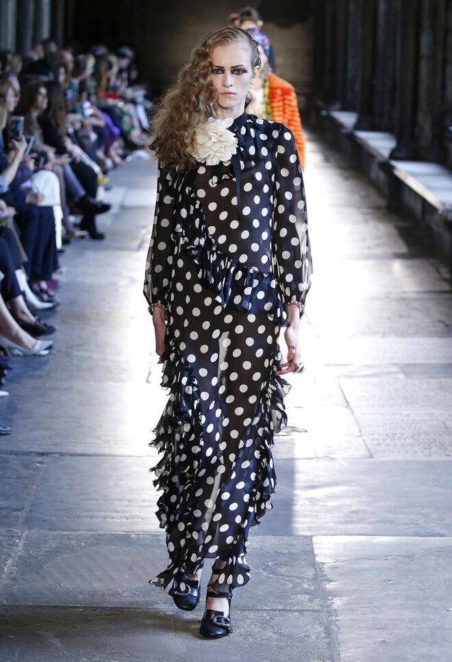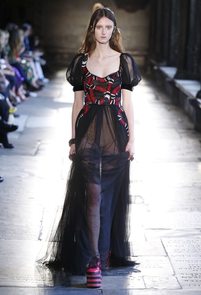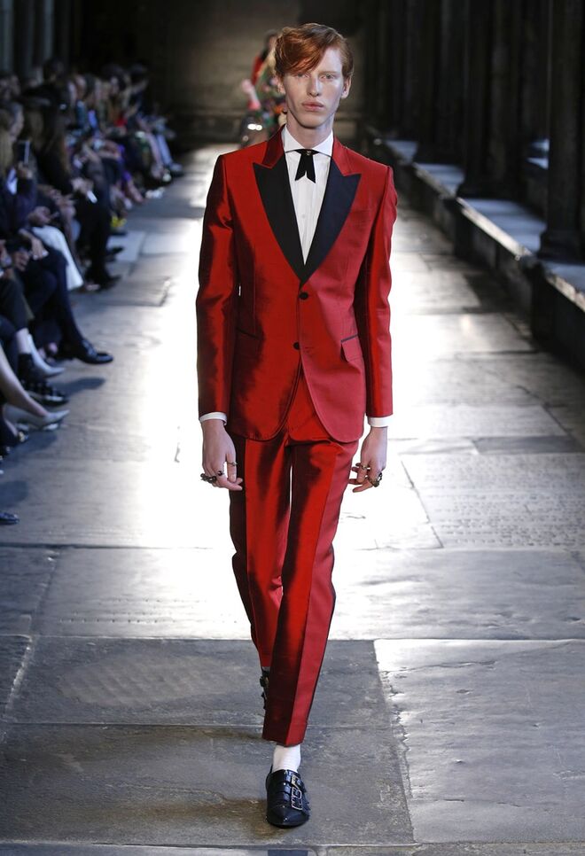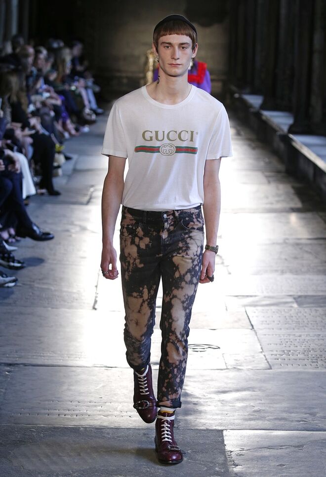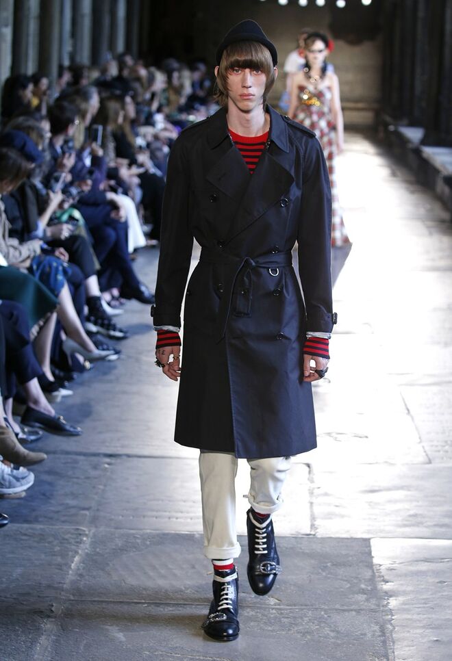 Arrojada e colorida. É a primeira impressão da nova criação do designer Alessandro Michele para a Gucci, uma proposta para a coleção Cruise. A multiplicidade de padrões é proporcional à quantidade de materiais, das rendas ao glitter, dos bordados ao chiffon, da seda ao pêlo. Muitos deles incorporados numa só peça. Saltam à vista as peças com estampados florais e geométricos, os casacos compridos com padrões fortes, o denim bordados com animal print ou mesmo leões, cobras e gatos, e tons novos como o verde água, o rosa salmão, o azul celeste ou o verde esmeralda. O lettering surge em alguns coordenados, com frases como "blind for love", e a alusão à bandeira inglesa surge num ou noutro pormenor. O calçado enche-se de detalhes, como pérolas ou chapas, tiras com presilhas, e os icónicos mary-janes voltam na próxima estação fria.