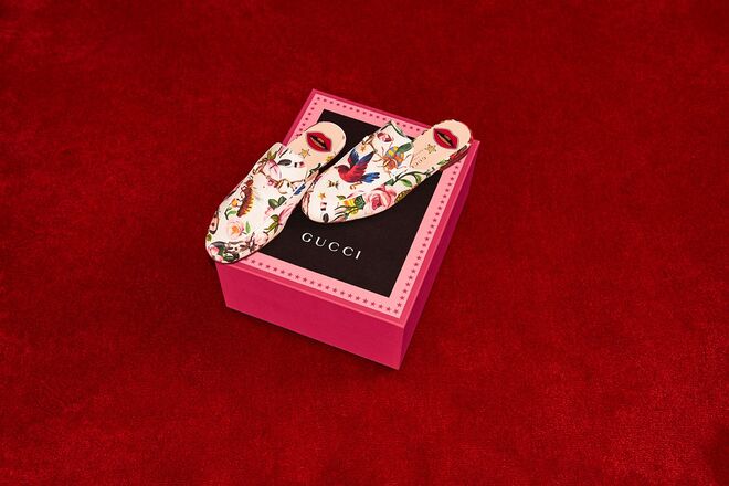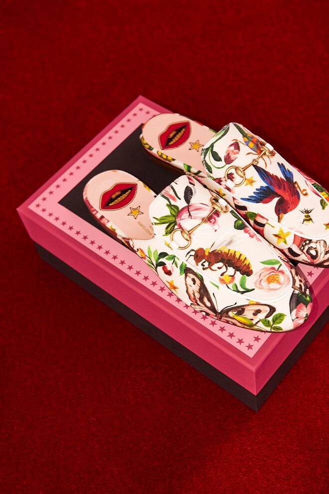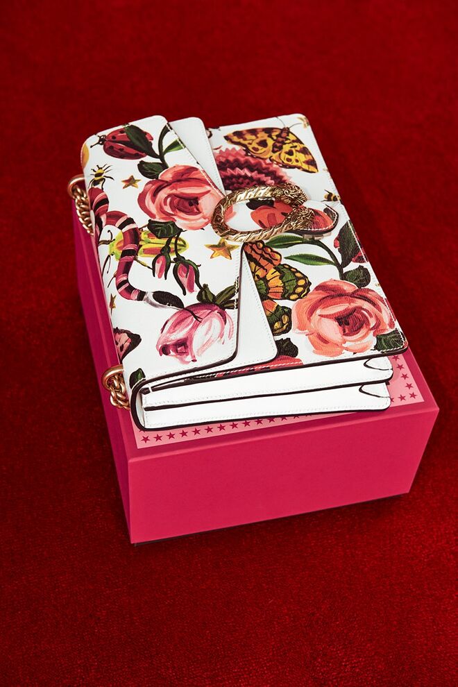 A coleção cápsula Gucci Garden será entregue em caixas personalizadas em tons preto-rosa-vermelho e sacos de papel com pegas de tecido preto. Todas as peças serão embrulhadas em papel de seda vermelho, fita de tecido preto com estrelas vermelhas e dentro de bolsas de flanela vermelha.