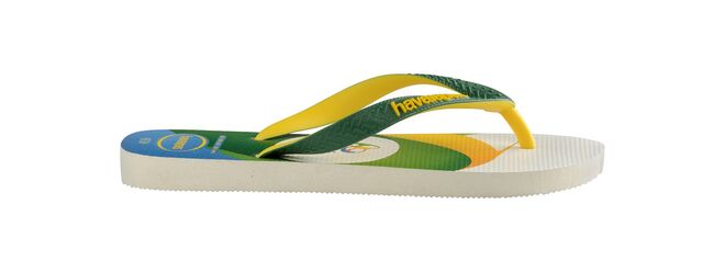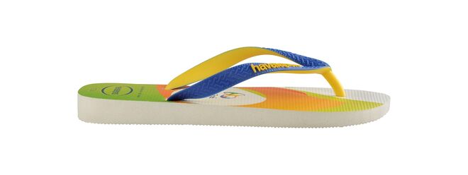 O modelo Top é unissexo com tiras em dois tons, encontram-se disponíveis em azul e amarelo ou verde e amarelo com o logótipo Havaianas a contrastar.