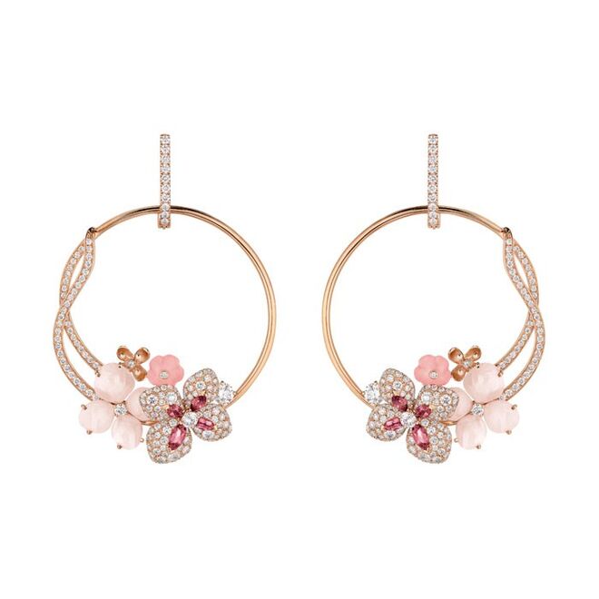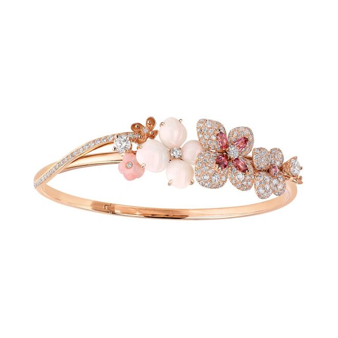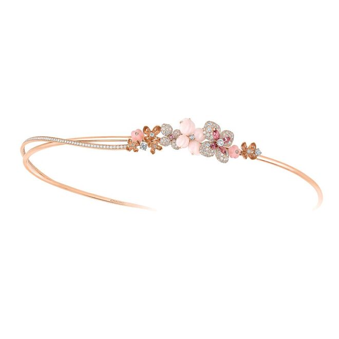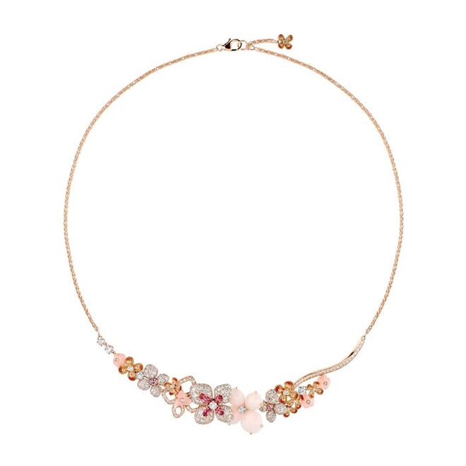 Peças únicas que expressam o melhor do "savoir-faire" da Chaumet, com colares, pulseiras, anéis, relógios e brincos, em ouro branco, ouro amarelo ou - ouro rosa, e em todas as matizes delicadas das pedras preciosas: o branco e o rosa nas opalas, as variações subtis de rosa nas turmalinas e nas safiras, o brilho e a sofisticação dos diamantes.