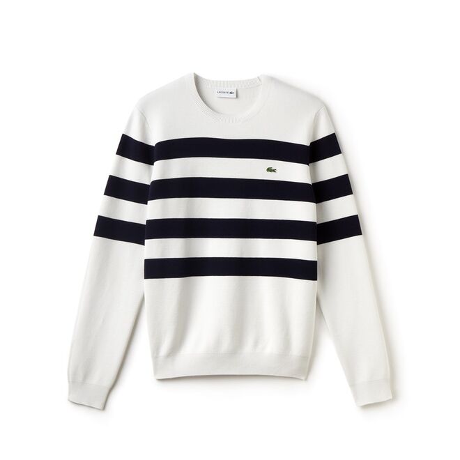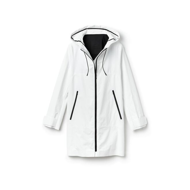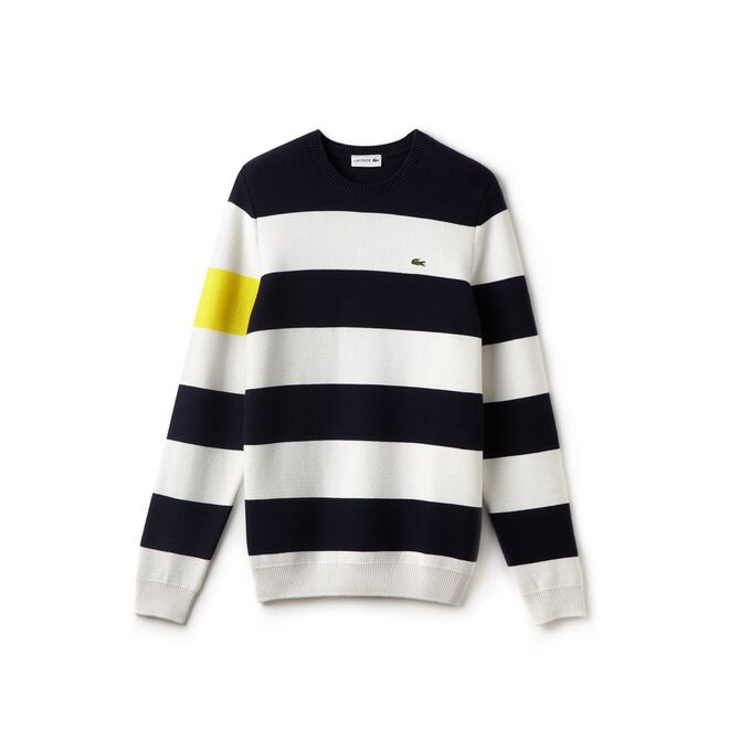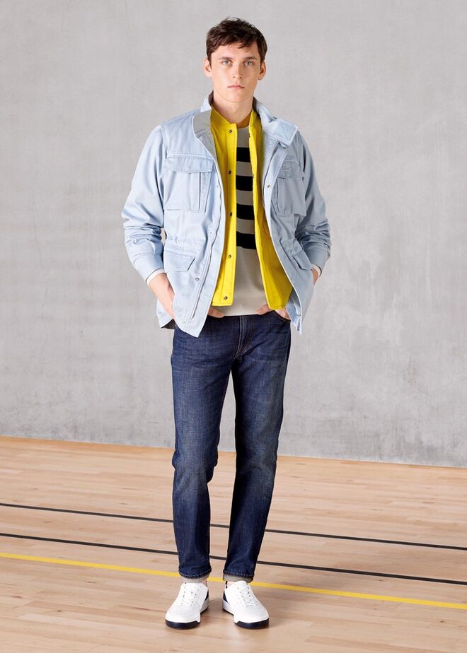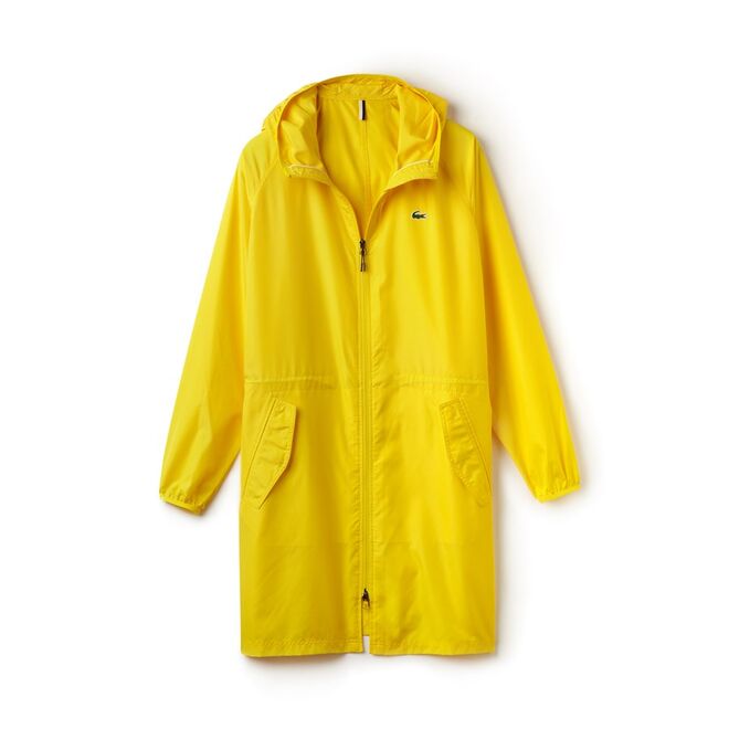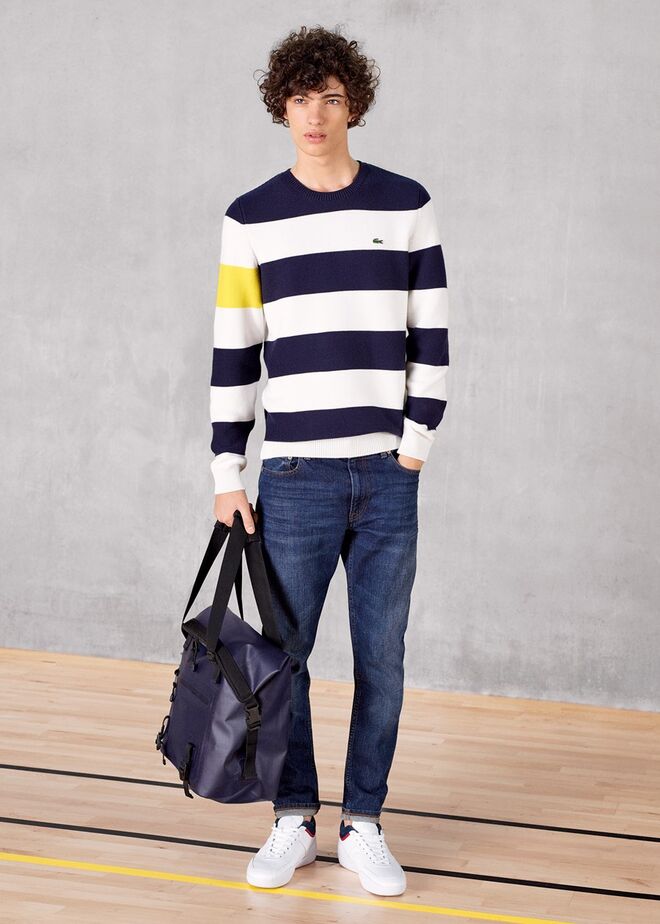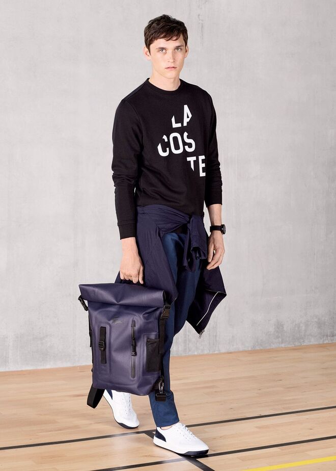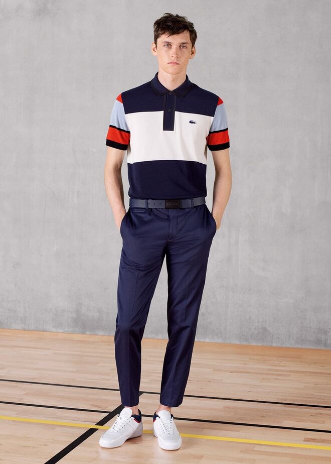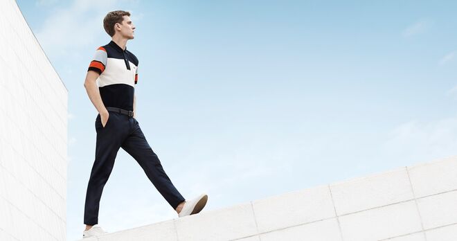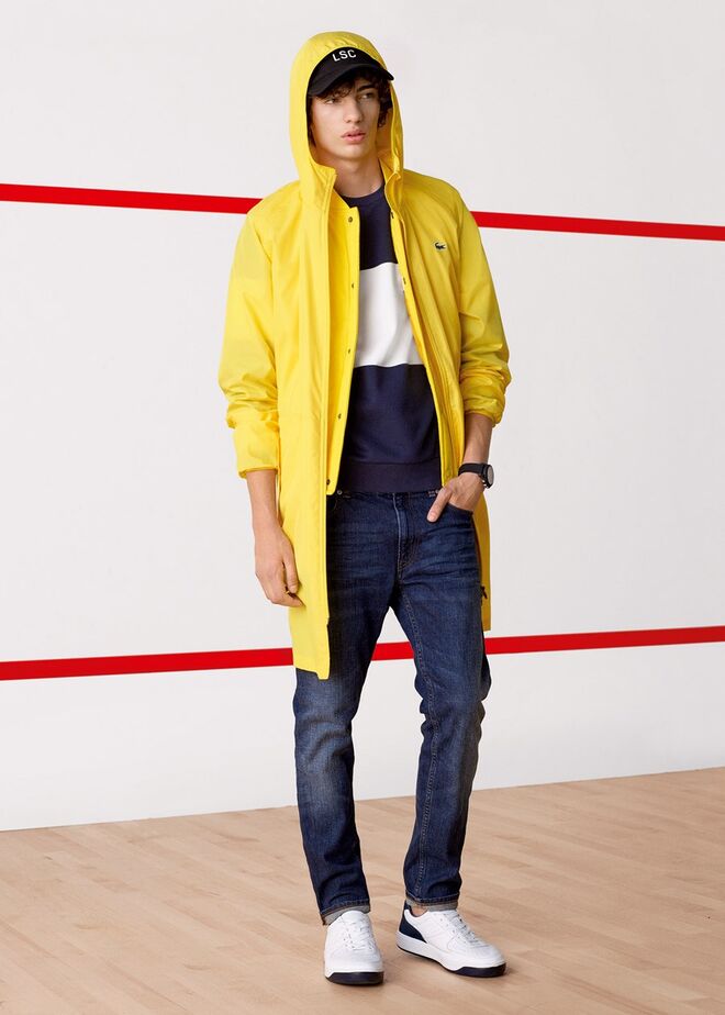 Para homem, os tecidos de eleição são o nylon e o neoprene, para reforçar a versatilidade e funcionalidade dos looks. À prova de água, entre a cidade e o alto mar, surge uma parka amarela que tanto protege do sol como repele a chuva. Já as riscas pretas e brancas da camisola em tricô saem do mar e dos courts, conduzindo o crocodilo até às influências do râguebi para um estilo que ganha força. Quando um casaco modelo safari altera um pouco a sua personalidade e surge azul claro, os clássicos reinventam-se. O último destaque vai para o pólo da linha Made in France que na sua combinação geométrica de vários blocos de cor ganha uma elegância e sofisticação inspiradas no desporto.