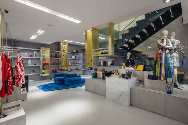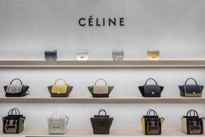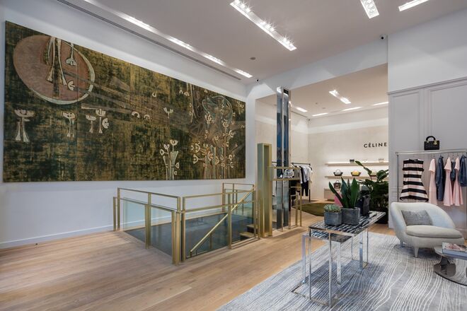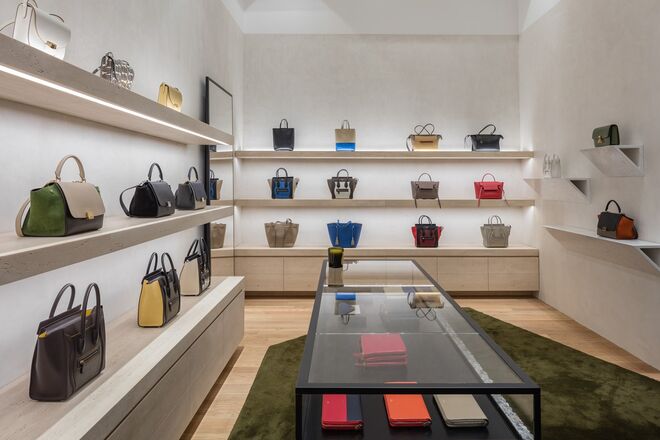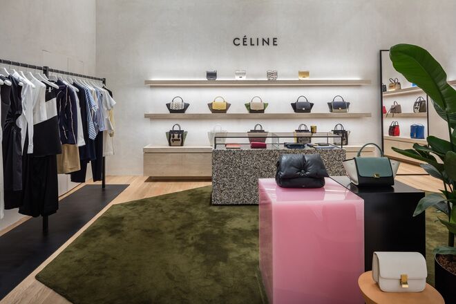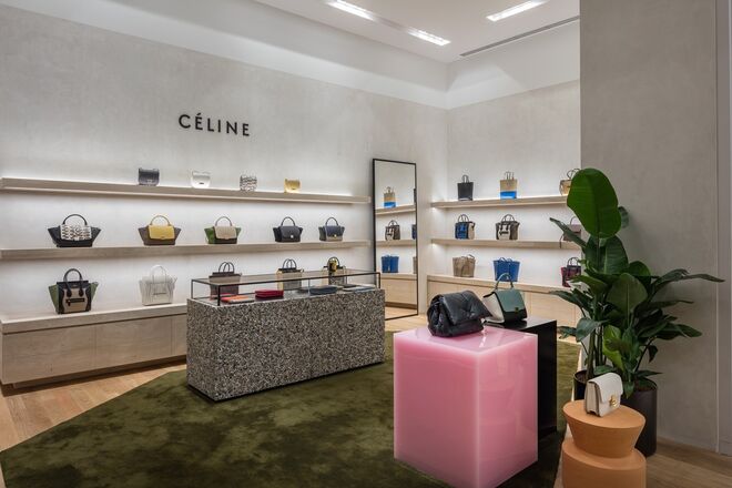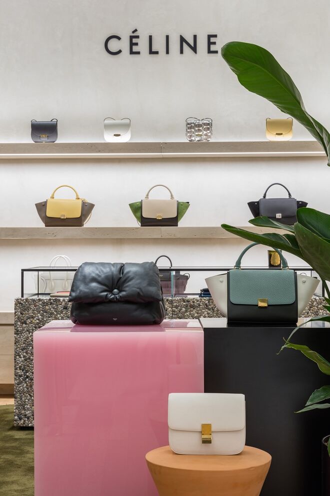 O espaço Céline utiliza peças em mármore Tavertino da Toscania e um tapete de formas irregulares de cor verde-escuro que sobressai dos tons quentes e suaves das suas paredes. De destacar o jogo de cubos e a montra totalmente decorada com Onix.