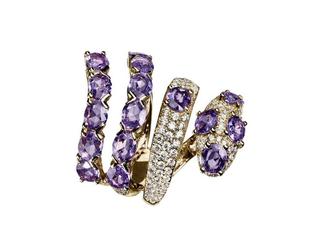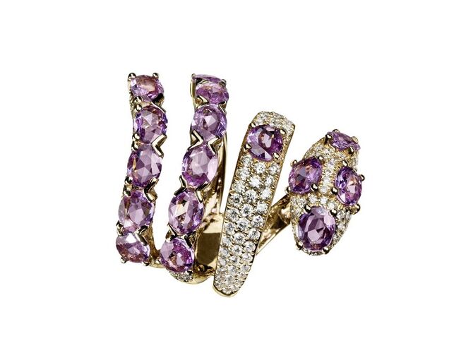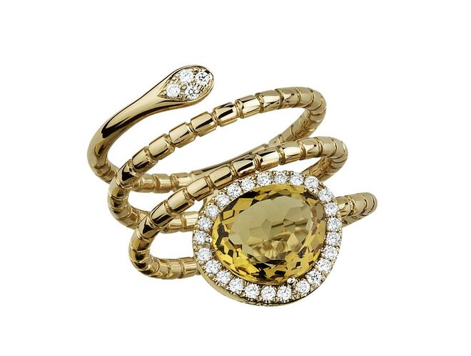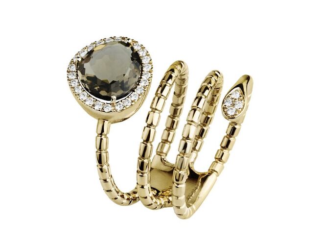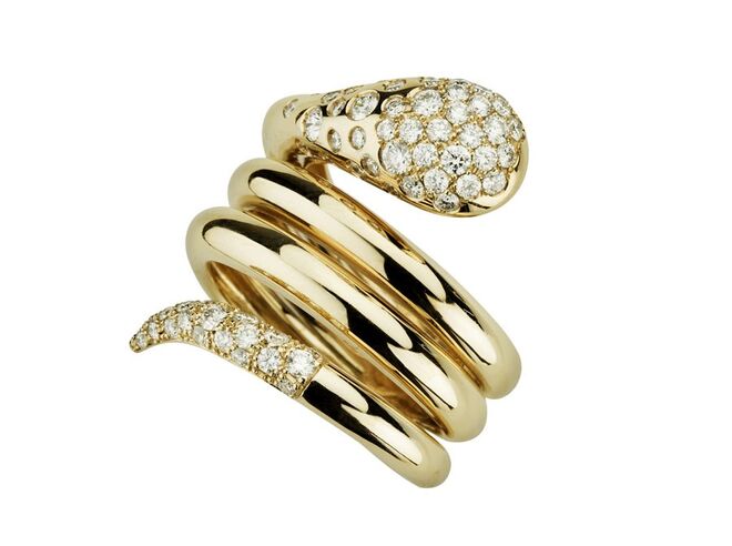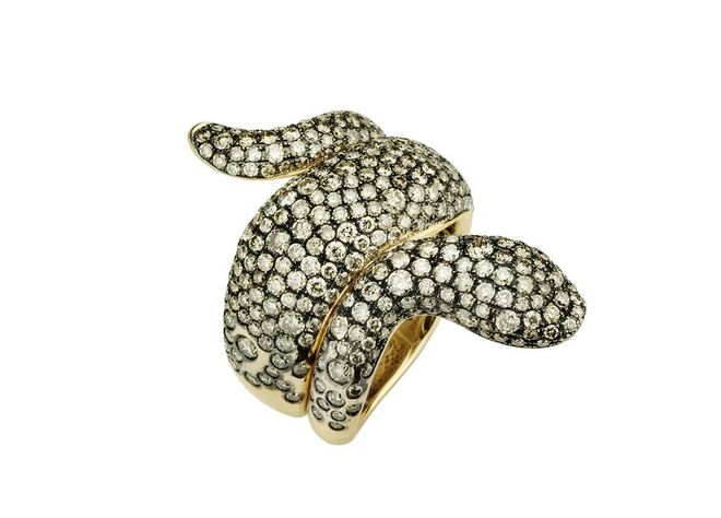 Cravejado a diamantes com tanzanites ou safiras rosa que adornam a cabeça e parte do corpo da cobra, são anéis simultaneamente distintos e leves. Peças em que o ouro rosa ganha maior expressividade desenhando de forma subtil e minimal a pele de o animal, com quartzo fumado e citrino na cabeça da cobra, orlada a diamantes. Em ouro rosa cravejado a diamantes brancos ou castanhos, o desenho espiral do corpo da cobra ganha expressividade e assume protagonismo.